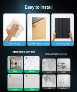 1. Principio Absorbente de Sonido: El material de alta calidad y la estructura porosa en los paneles insonorizantes capturan y absorben vibraciones de aire en ondas de sonido, lo que reduce la reflexión de sonido y eco, mejora la pureza y claridad del sonido y se instalan como un todo para una mayor reducción de ruido. 2. Panel Acústico de Ladrillo: El diseño de ladrillo añade belleza a su interior, complementa diversos estilos de decoración, proporciona absorción de sonido y realza el atractivo visual, se puede cortar y ensamblar en diferentes formas para diseños personalizables. 3. Material de Alta Calidad: Hecho de 100% material de fibra de poliéster de alta calidad, los paneles de espuma insonorizante para paredes son duraderos y resistentes al desgaste, hechos de botellas de plástico reciclado y seguros de utilizar. 4. Autoadhesivo: Los paneles insonorizantes son autoadhesivos, se pueden instalar sin herramientas adicionales, se aplican fácilmente a paredes, puertas, ventanas, y techos. 5. Sobre Desmontaje: Si es necesario desmontar, caliente la placa de aislamiento acústico con un secador de pelo antes de despegarla. 6. Amplia Aplicación: Los paneles acústicos autoadhesivos se utilizan ampliamente para tratamiento acústico en diversos espacios, incluidos hogares, oficinas, estudios de grabación, transmisiones en vivo y salas de conferencias, mejoran el ambiente acústico, mejoran la calidad del sonido y el confort. 7. Área de Cobertura: 18 piezas cubren 23.23 pies cuadrados de pared los paneles de absorción de sonido de azulejos de pared adoptan un diseño de bisel de 45 , no dejan huecos durante la instalación y mantienen la estética.