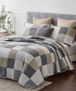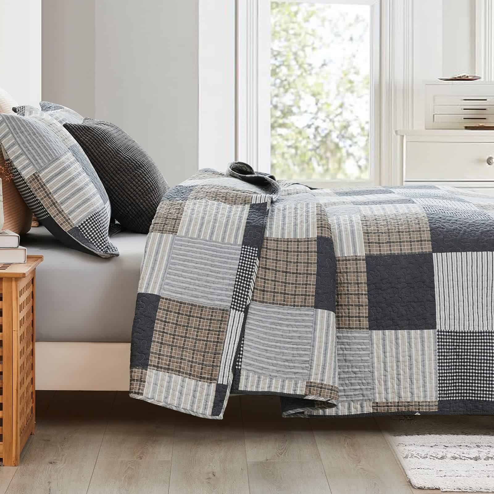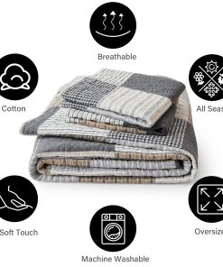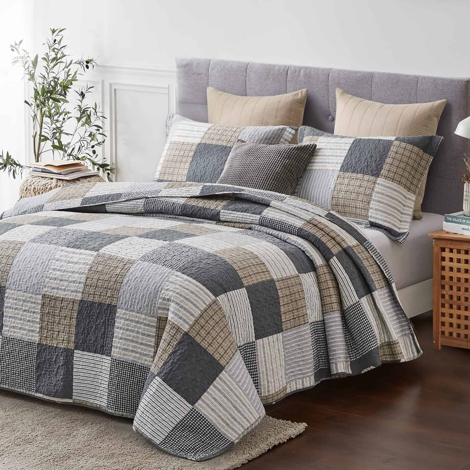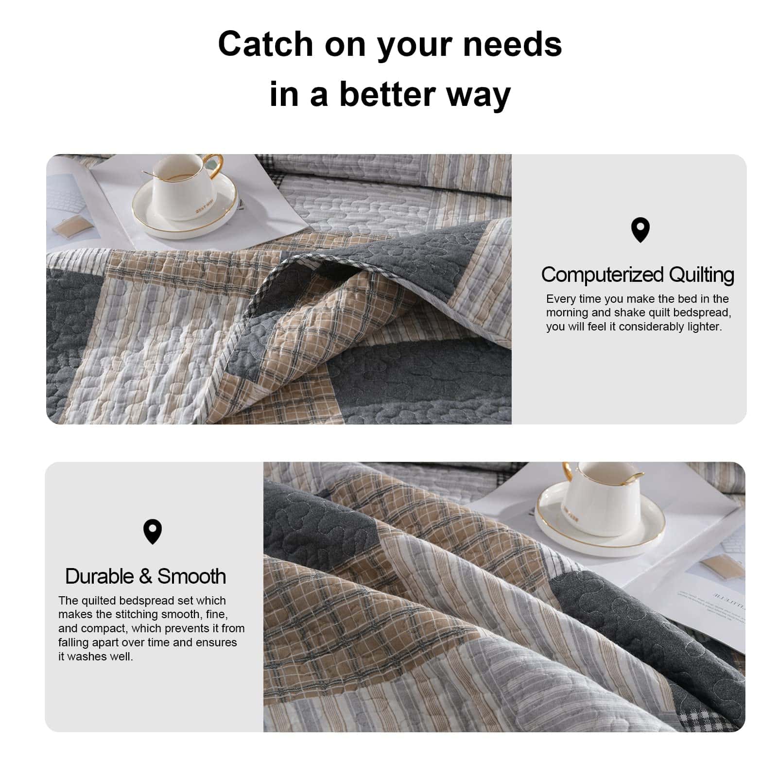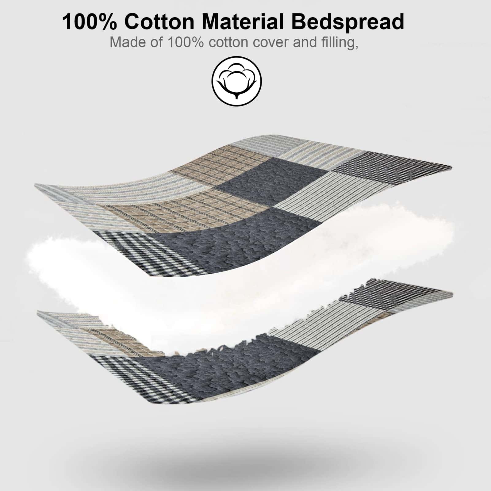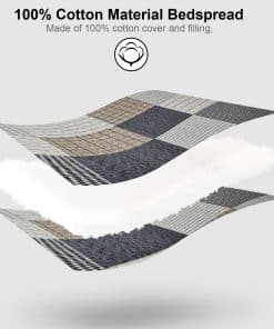 PANGUSHAN Juego de colcha de algodón 100% tamaño King, Colcha a cuadros y patchwork, Ropa de cama edredones, Colcha reversible de granja, Colcha King blanco/gris/gris/marrón/negro/crema, 3 piezas. Este juego de colchas está hecho de un 100% de algodón natural, lo que garantiza que sea saludable y transpirable. Es suave al tacto, amigable con la piel y duradero. Este juego de colchas es versátil y puede adaptarse a la decoración de diversas habitaciones, como dormitorios, salas de estar, habitaciones principales, habitaciones de huéspedes, estudios, dormitorios y remolques. Además, su diseño ligero y portátil lo convierte en una excelente opción tanto para habitaciones interiores como para acampar al aire libre. Es ampliamente aplicable, por lo que también puede ser un buen regalo. Además, este juego de colchas se puede utilizar en las cuatro estaciones del año: primavera, verano, otoño e invierno. Si eres propenso a sudar más durante el sueño, esta colcha se puede usar sola en climas fríos, o en combinación con una manta o un edredón. El set incluye una colcha tamaño King de 3 piezas que consta de 1 colcha (98 x 106 pulgadas) y 2 fundas de almohada (20 x 36 pulgadas). La calidad del material y las costuras firmes y duraderas garantizan un uso a largo plazo. Su diseño ligero facilita su transporte, cuidado y lavado, incluso si tienes mascotas. Para conservar esta colcha, se recomienda lavarla a máquina por separado en agua fría, secarla a baja temperatura y no usar lejía. La colcha conservará el calor y su forma original después del lavado, lo que la convierte en una excelente elección para aquellos que tienen mascotas y desean un producto fácil de limpiar.