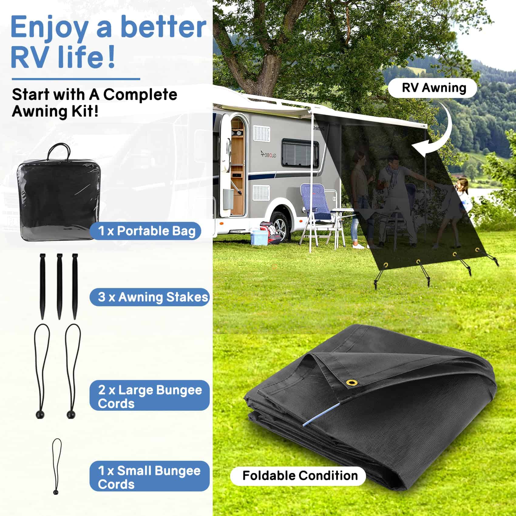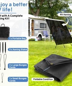 5. Portabilidad y almacenamiento conveniente: Nuestro Kit de Toldo de RV incluye una bolsa de transporte ligera y portátil para viajes fáciles. Ya sea acampando, de picnic o de vacaciones, lleve con facilidad su pantalla de sombra para disfrutar de confort y conveniencia en cada aventura.