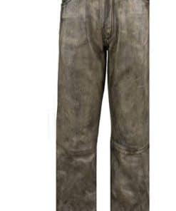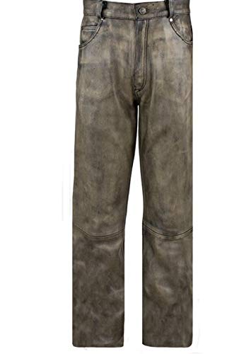 Hecho de hermoso cuero de vaca desnudo marrón con acabado envejecido. Cuenta con bolsillos profundos en la cintura y bolsillos traseros grandes. Tiene 6 trabillas de cuero para el cinturón. El cierre frontal es de un solo botón a presión con cremallera.