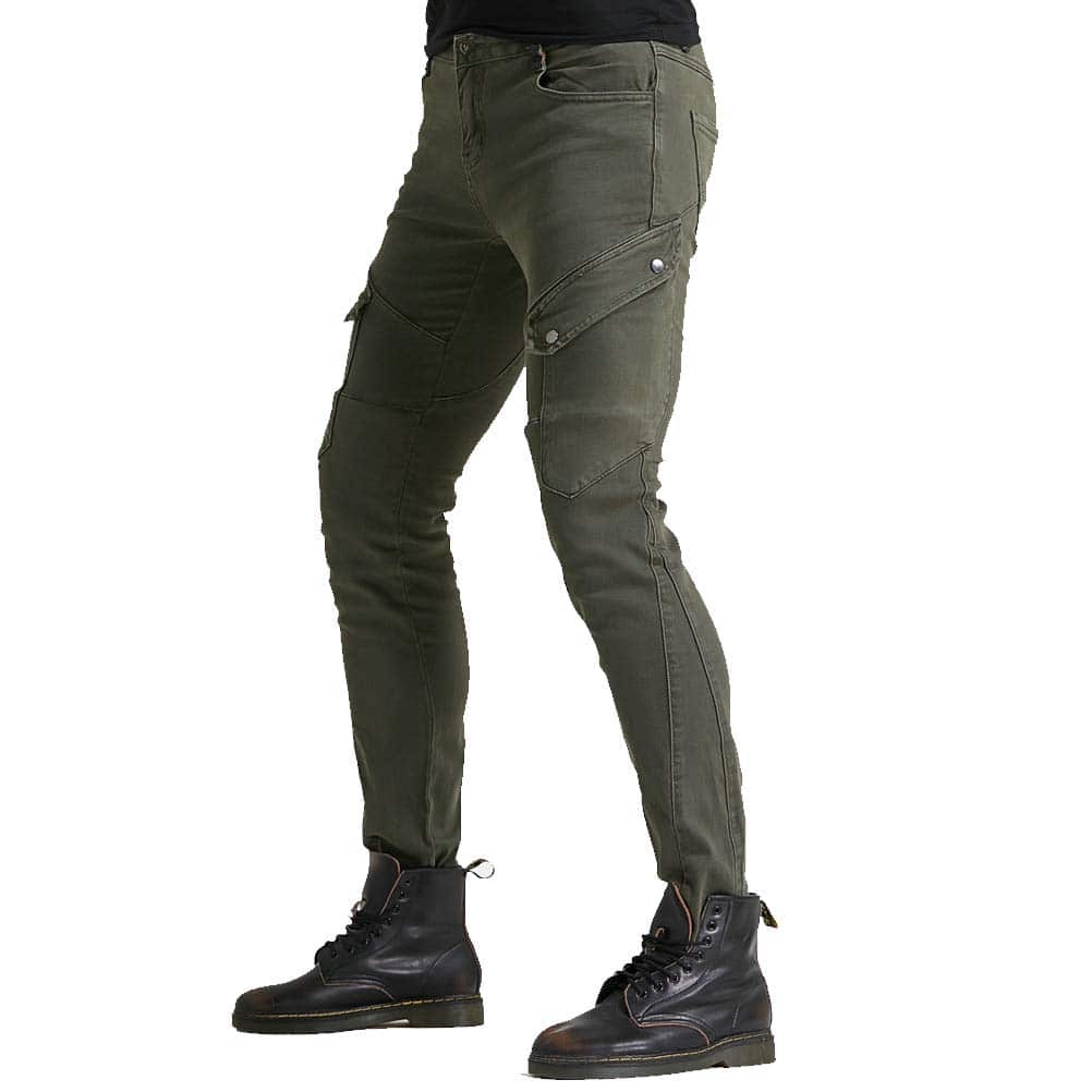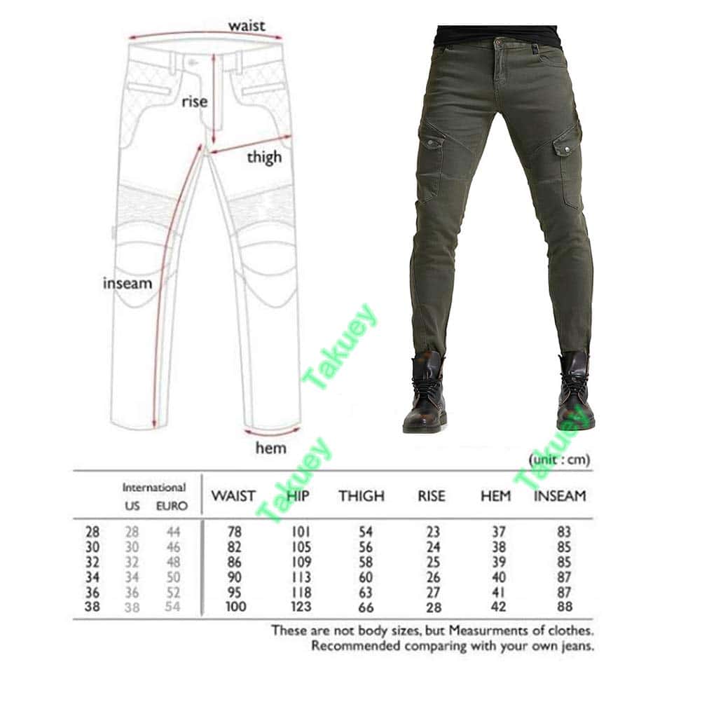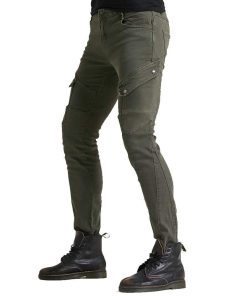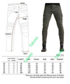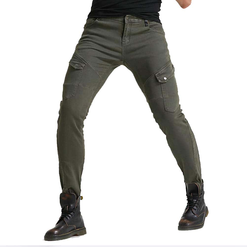 Incluye: 1 X Pantalones de moto + 2 X Protectores de rodilla + 2 X Protectores de cadera. Material: Denim de 14 oz, 97% Algodón 3% Spandex. Color: Verde Militar, Negro. Tallas: S 28, M 30, L 32, XL 34, XXL 36, XXXL 38. Características: Diseño de moda y seguridad al montar, 4 protectores de rodilla y cadera, perfecto para moto y uso diario. Certificación de Equipos de Protección de Moto CE EN1621-1: 1997 de la Unión Europea. Diseño plegable de rodilla y cintura trasera para mayor flexibilidad.