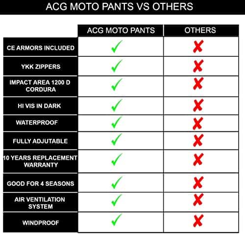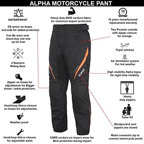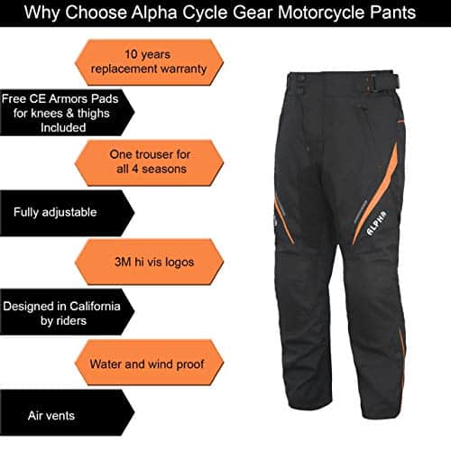 2. GARANTÍA DE 10 AÑOS | Los pantalones de protección para motocicletas ALPHA CYCLE GEAR lo cubren por 10 años. Si encontrara algún defecto en nuestra ropa de motocicleta, envíenos un mensaje y le enviaremos un reemplazo para cubrir la garantía de estos pantalones de moto.
