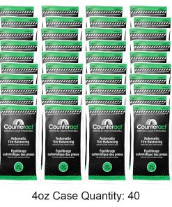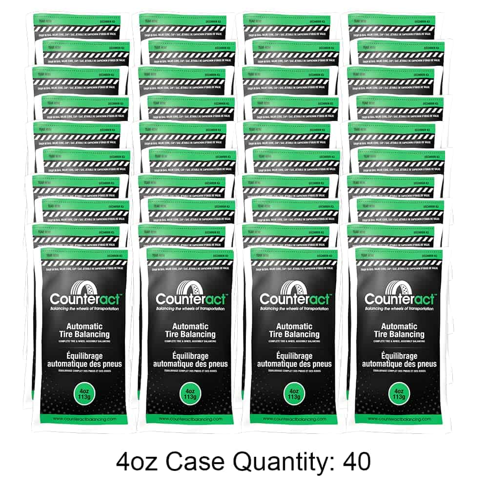Para lograr resultados óptimos, es importante utilizar el tamaño de paquete adecuado para cada neumático. Como regla general, la cantidad de Perlas de Equilibrado Counteract requerida por neumático se basa en una onza por trece libras de combinación de neumático y llanta. Si no está utilizando un aplicador y está vertiendo el contenido de la bolsa directamente en el neumático, es imperativo que ninguna parte del contenido de la bolsa termine en la zona de asiento del talón del neumático y la llanta. Si está utilizando nuestras bolsas para arrojar, abra y deseche solo la bolsa exterior y arroje la bolsa interior transparente que contiene Contrarrestar directamente dentro de la cavidad del neumático. Contrarrestar Balance no se hace responsable de la pérdida de aire o daños en el neumático debido a una instalación incorrecta o comprobación de aire. Para reducir la posibilidad de fugas de válvulas, se recomienda el uso del núcleo de válvula proporcionado y la tapa de válvula metálica.