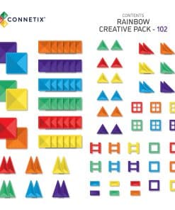 ¡Despierta horas de creatividad, diversión y juego no estructurado ilimitado con el Paquete Creativo de 102 Piezas Rainbow de Connetix! Proporcionando infinitas posibilidades para la creatividad y el aprendizaje a través del JUEGO, el Paquete Creativo de 102 Piezas Rainbow de Connetix presenta una variedad de formas de tiles magnéticos en cada color del arcoíris, incluyendo cuadrados pequeños y grandes, triángulos equiláteros, rectos e isósceles, además de cercas, ventanas y marcos de puertas. ¡Es una gran opción de inicio para el juego en familia y la creación de creaciones Connetix MÁS GRANDES! Ya sea jugando de forma independiente o con amigos y familiares, el Paquete Creativo fomenta el aprendizaje STEAM, las habilidades motoras finas y gruesas a medida que los niños crean castillos y cohetes más grandes, muros altos, carreras de bolas y caídas de monedas, puentes y torres, así como explorar patrones y formas, creando cajas de clasificación por colores, ¡además de mucho más. El Paquete Creativo de Connetix también apoyará el desarrollo de la perseverancia y la resiliencia a medida que los niños diseñan construcciones a mayor escala, poniendo a prueba los límites de su imaginación. Los juguetes de juego abierto no solo ayudan a desarrollar la imaginación y la creatividad de un niño, también crecen CON él a medida que aprenden y desarrollan y el juego se vuelve más evolucionado.