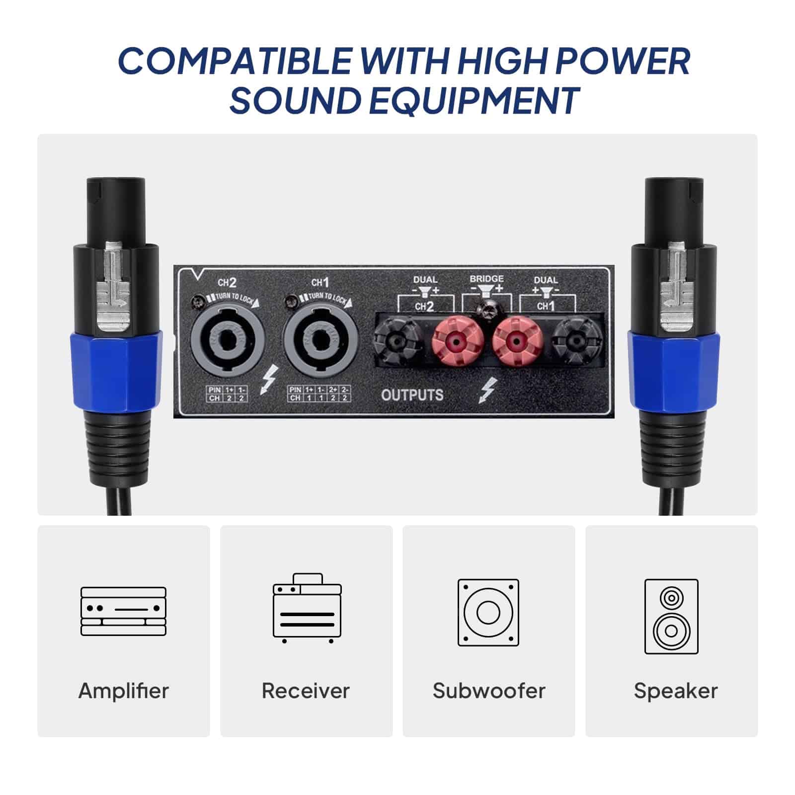 2. CONECTORES TIPO NL4FC: El conector Speakon está etiquetado +1, -1 y +2, -2 como dos conjuntos de terminaciones. Nuestro cable Speakon está conectado con cableado de 2 núcleos para conexiones de señal positiva y negativa mientras se alimenta un altavoz con un solo canal de amplificador.