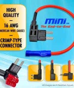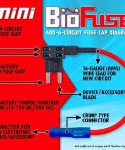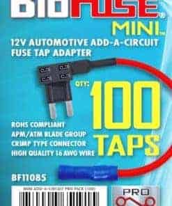 INCLUYE: (100) porta fusibles MINI de calibre 16 (7 pulgadas). Los porta fusibles BioFuse están diseñados para interceptar un circuito de 12V existente en la ubicación de su caja de fusibles al agregar un circuito adicional sin necesidad de cortar, empalmar o alterar su equipo original del fabricante. Los porta fusibles BioFuse permiten una instalación de calidad y eficiente de dispositivos o accesorios como: Dashcams, cámaras de retroceso, luces LED, alarmas, estéreos, cajas negras, unidades GPS, puertos USB y más. Conectores: hojas de aleación tipo MINI con conector tipo crimpado. Conductor: cobre estañado trenzado. Especificaciones del cable: cable de conexión de un solo conductor para electrodomésticos (AWM) 1015. Temperatura nominal: -20 C a 105 C con una clasificación de voltaje de 600 Vca, 750 Vcc.