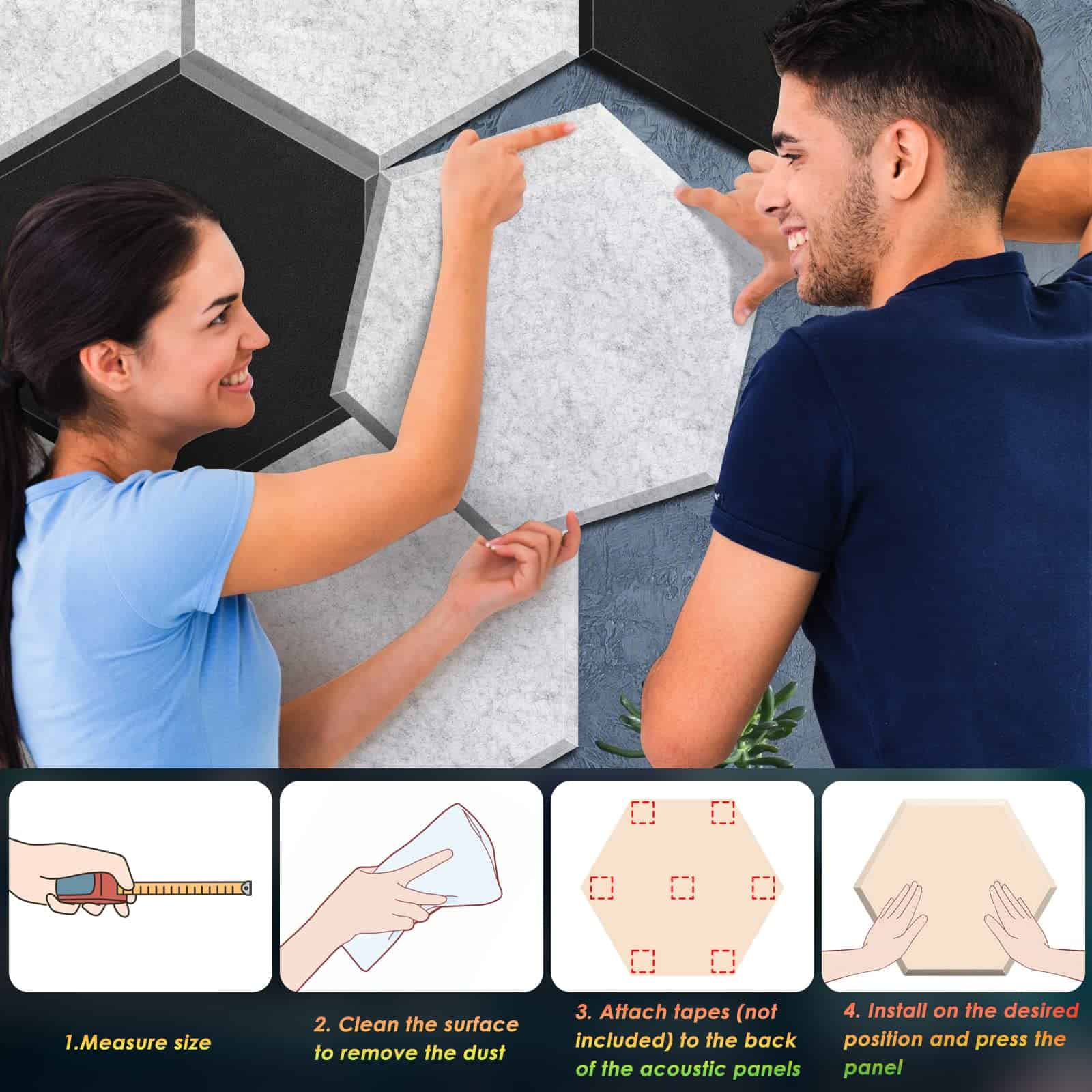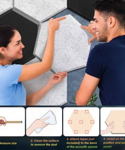 1. FÁCIL DE INSTALAR: Nuestros paneles acústicos son fáciles de cortar e instalar. ¡La instalación de nuestros paneles acústicos es simple! ¡No se necesitan herramientas especiales! Simplemente coloque los paneles acústicos con cintas adhesivas y instálelos en la superficie lisa. Tenga en cuenta: las cintas adhesivas de alta resistencia 3M, adhesivo en aerosol y clavos no están incluidos en el paquete y deben comprarse por separado.