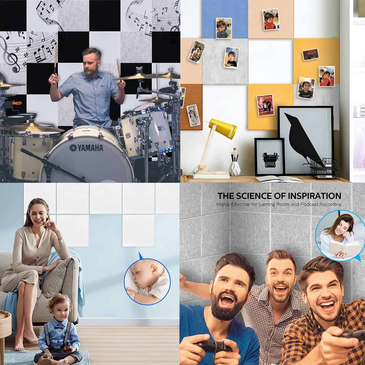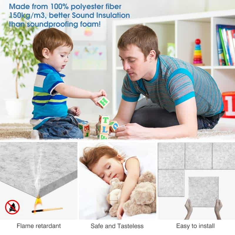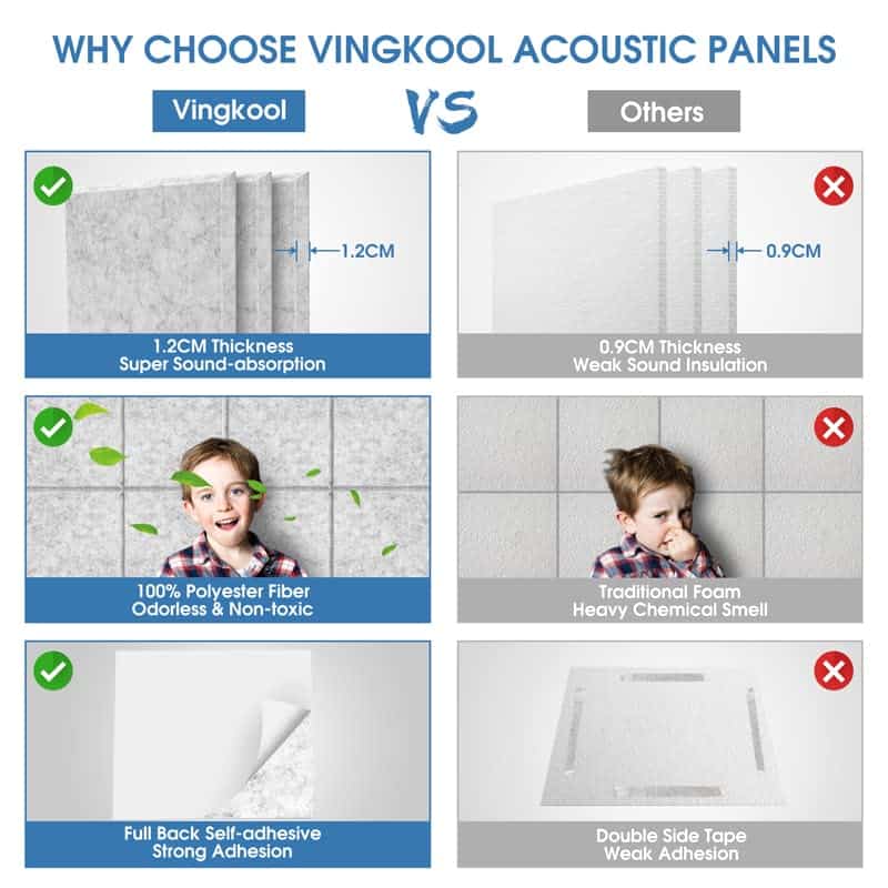 1. Por qué Vingkool La mayor diferencia de otros paneles acústicos en el mercado es que nuestros paneles de pared insonorizantes añaden un grosor mejorado de 1,2CM, lo cual es un avance en absorción de sonido en comparación con los comunes paneles de espuma insonorizante de 0,9CM de grosor, y pueden eliminar ecos y ondas estacionarias de manera más efectiva. Proporcionándole un ambiente tranquilo y cómodo. Puede elegir el grosor (0,9CM o 1,2CM de grosor) de acuerdo a las necesidades de aislamiento acústico de su hogar. 2. Fácil de Instalar Con diseño autoadhesivo, solo necesita pelar el papel de la parte trasera y pegar los paneles insonorizantes en la pared. Comparado con otros paneles de espuma para pared que requieren la compra de cinta adhesiva de doble cara o pegamento de vidrio para instalar, nuestros paneles acústicos autoadhesivos se pueden instalar en varias superficies (paredes, puertas, ventanas, techos, etc.) sin necesidad de herramientas, ¡lo cual ahorra mucho tiempo y dinero! Puede quitar fácilmente los paneles calentándolos con un secador de pelo si es necesario. 3. Alta Densidad y Respetuoso con el Medio Ambiente Paquete de 12, cada uno de 12″ X 12″ X 0.4″. Hecho de Fibra de Poliéster 100%, los paneles acústicos de alta densidad de Vingkool tienen mejor capacidad de insonorización que otras espumas absorbentes de sonido y son excelentes para absorber sonidos no deseados y reducir ecos no deseados, ondas, reverberaciones y ecos de aleteo. No tóxico e inodoro, retardante de llama de nivel B1, seguro para personas mayores, niños, mascotas, muy adecuado para hogares, estudios de grabación, etc. 4. Tanto Estéticos como Funcionales Nuestros paneles acústicos absorbentes de sonido están disponibles en 4 colores: negro, blanco, gris y azul claro. Disponible para bricolaje, decora tu estudio de grabación y tu habitación. Puedes combinar los colores a tu gusto, también puedes usar los mismos paneles acústicos de color para decoración de pared. Define tu espacio en la pared y controla el sonido para crear tu propio espacio acústico perfecto. Mejora la artesanía estética de tu habitación mientras satisfaces tus necesidades de insonorización. 5. Amplio Uso para Tratamiento Acústico Los paneles acústicos de pared Vingkool absorben los ecos y el ruido circundante en la habitación, proporcionándonos un espacio tranquilo. Ideal para estudios de grabación profesionales, salas de ensayo, salas de conciertos, estudios de radiodifusión, iglesias, salas de cine en casa, cabinas vocales, estudios caseros, oficinas y podcasting. Le permiten disfrutar de la alegría sin preocuparse por molestar a sus vecinos o protegerlo del ruido circundante, lo que le permite pasar un tiempo tranquilo y relajado.