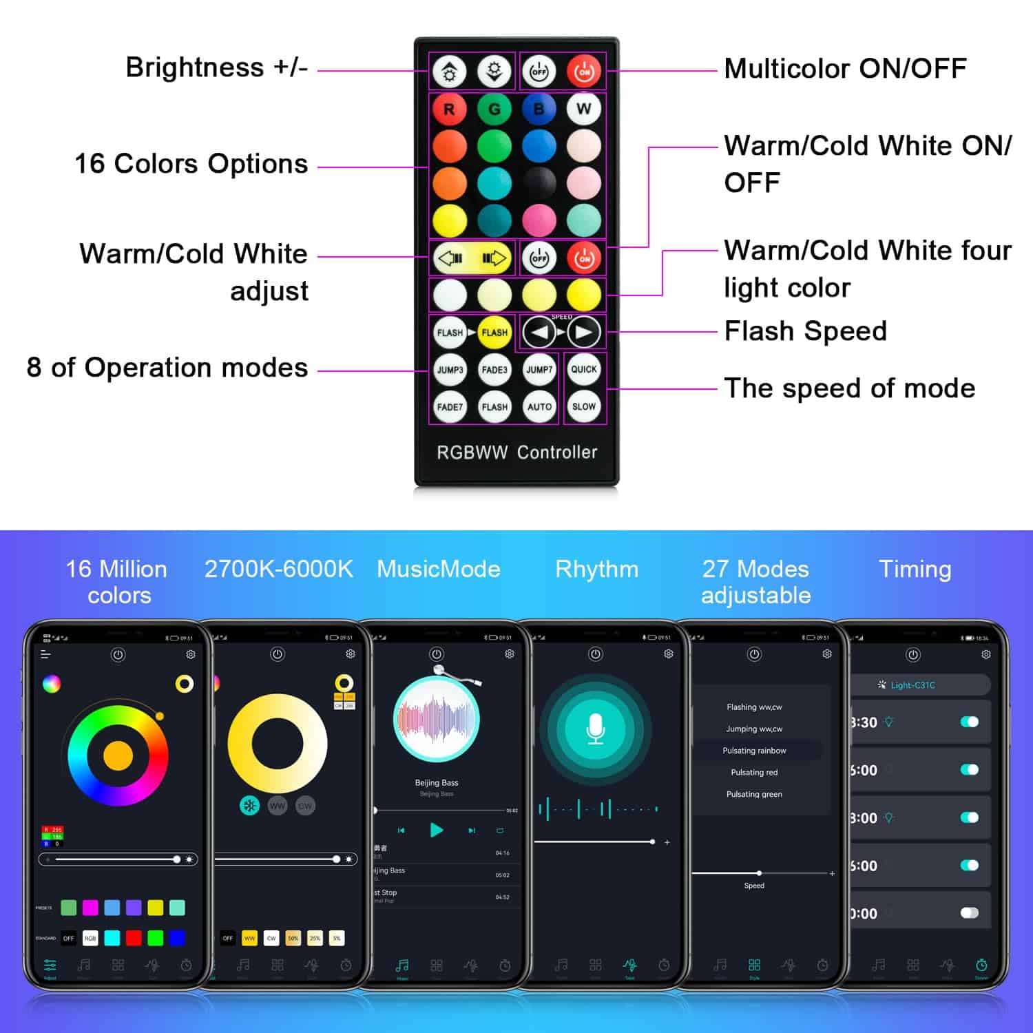 5. Sincronización con Música No solo la APP tiene la capacidad de reconocer automáticamente la música en el teléfono, sino que la luz de dj también puede reconocer el sonido del micrófono del teléfono y sincronizar las luces con el ritmo de la música. Hace que la era de la iluminación funcione perfectamente a través de diferentes funciones.