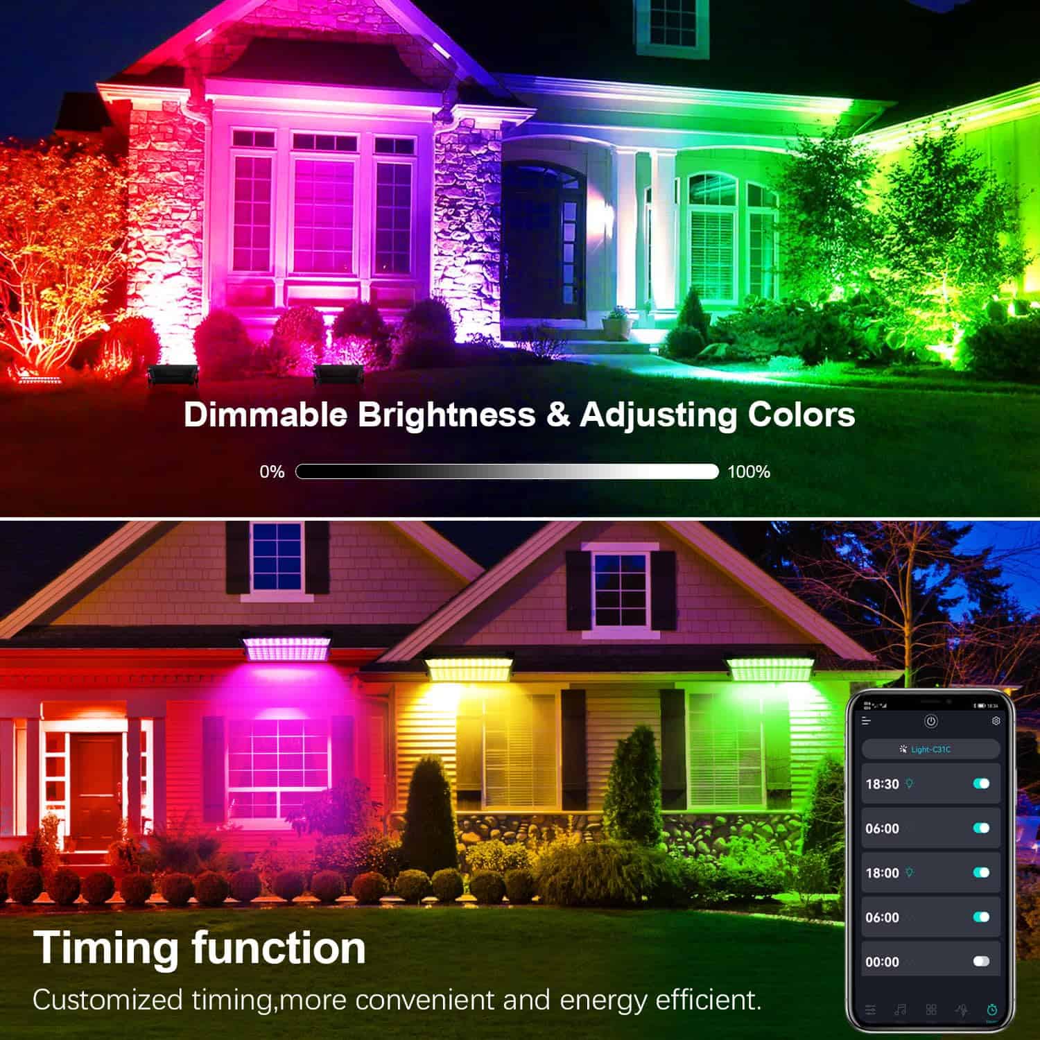 240W de Alta Luminosidad Cada luz de lavado LED RGBCW de 120W tiene 180 perlas de alta calidad actualizadas, dos luces de lavado separadas se pueden combinar juntas con un soporte de montaje en forma de U para un total de 240W, que puede iluminar un área más grande, satisfacer la necesidad de actividades en el aula, cumpleaños, Navidad, Día de San Valentín, festivales, jardín, Halloween, fiestas, bodas y otras ocasiones que requieren áreas grandes de luz rgb. El foco uplight RGBCW con APP y control remoto de 40 teclas: 120W, Equivalente a 1000W, Blanco Cálido (2700K) a Blanco Frío (6500K) ajustable, CRI>85, 16 millones de colores multicolores y 20 modos dinámicos, función de temporizador, estroboscópico, escenas personalizadas. La barra de luces de inundación es adecuada para la iluminación diaria, de estado de ánimo y decorativa. Puedes usarla como iluminación de paisajes, luces de escenario, foco, luces estroboscópicas, luces de acento, luces de fondo, luces de seguridad. Es muy fácil de controlar por APP «fi light» y control remoto de 40 teclas. No es necesario registrarse ni tener conexión a internet. Impermeable IP66 La luz de lavado LED tiene una clasificación IP66 a prueba de agua, funciona en mal tiempo, como lluvia, nieve, aguanieve y nieve, cuando hay diferencia de temperatura, la barra de luz que cambia de color no mostrará gotas de agua, es adecuada para uso en interiores y exteriores. Puede ser la elección perfecta para la iglesia, Navidad, festivales, jardín, Halloween, fiestas, bodas, etc. Regulable El brillo de la barra de luces de lavado es ajustable, hay múltiples modos para elegir y la velocidad se puede ajustar. Sincronización con Música No solo la APP tiene la capacidad de reconocer automáticamente la música en el teléfono, sino que la luz de dj también puede reconocer el sonido del micrófono del teléfono y sincronizar las luces con el ritmo de la música. Hace que la era de la iluminación funcione perfectamente a través de diferentes funciones. Instalación Fácil y Enfriamiento Eficiente La barra de luces de dj está equipada con soportes de montaje que se pueden ajustar hacia arriba y hacia abajo 180 grados. La longitud del cable de alimentación es de 5 pies. Y puedes ajustar la luz led de lavado al ángulo que deseas iluminar e instalar fácilmente la iluminación de escenario led en el techo, paredes, suelo, etc. El diseño de aluminio fundido a presión y el eficiente diseño de refrigeración hacen que sea más duradero y confiable.