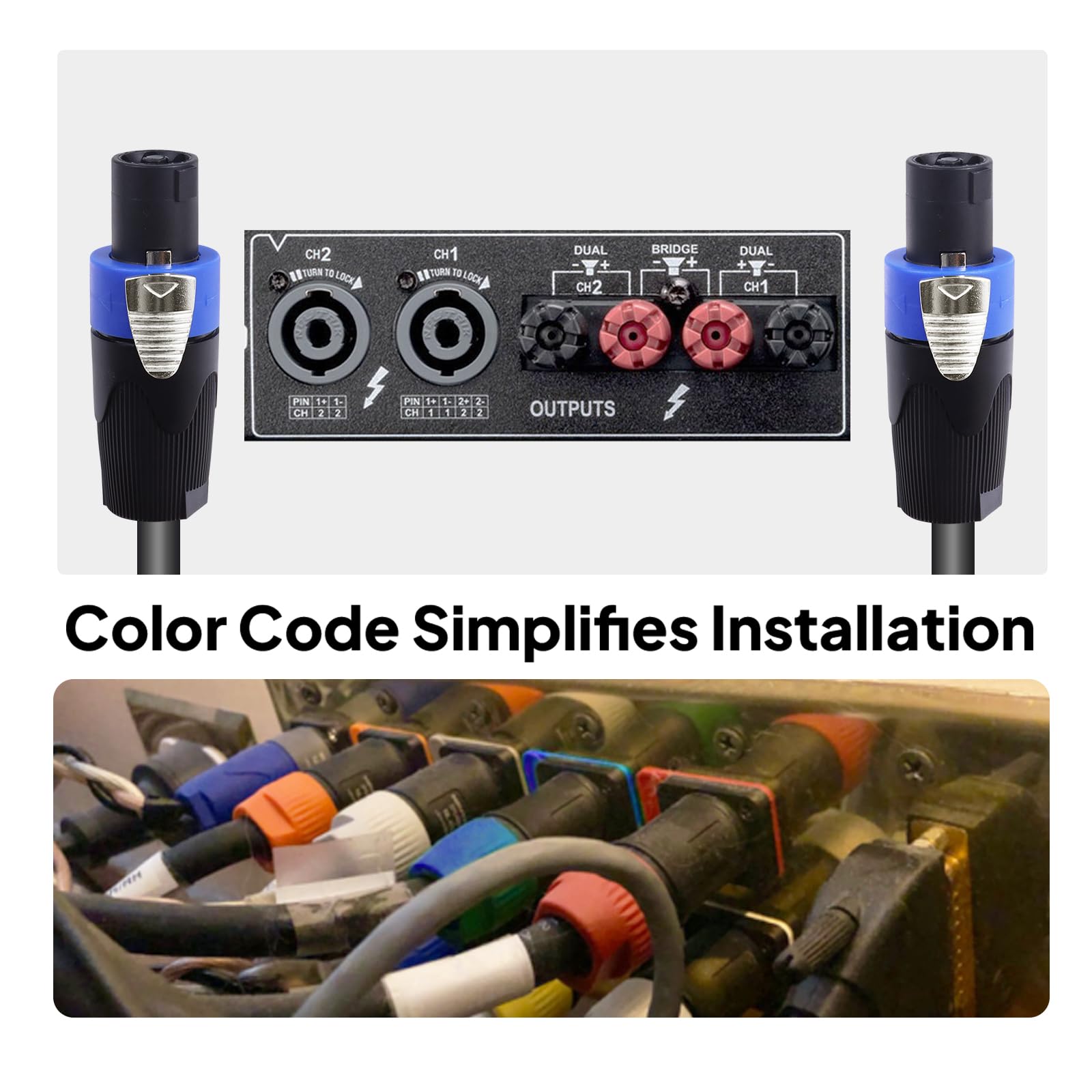 2. CODIFICA POR COLORES TUS CONEXIONES DE AUDIO: El paquete incluye 2 packs de cables Speakon. Uno terminado en adaptadores azules, el otro en naranja. Los conectores speakon codificados por colores son fáciles de identificar, lo que hace que el cable sea fácil de emparejar con los cables correctos correspondientes a las entradas y salidas correspondientes.