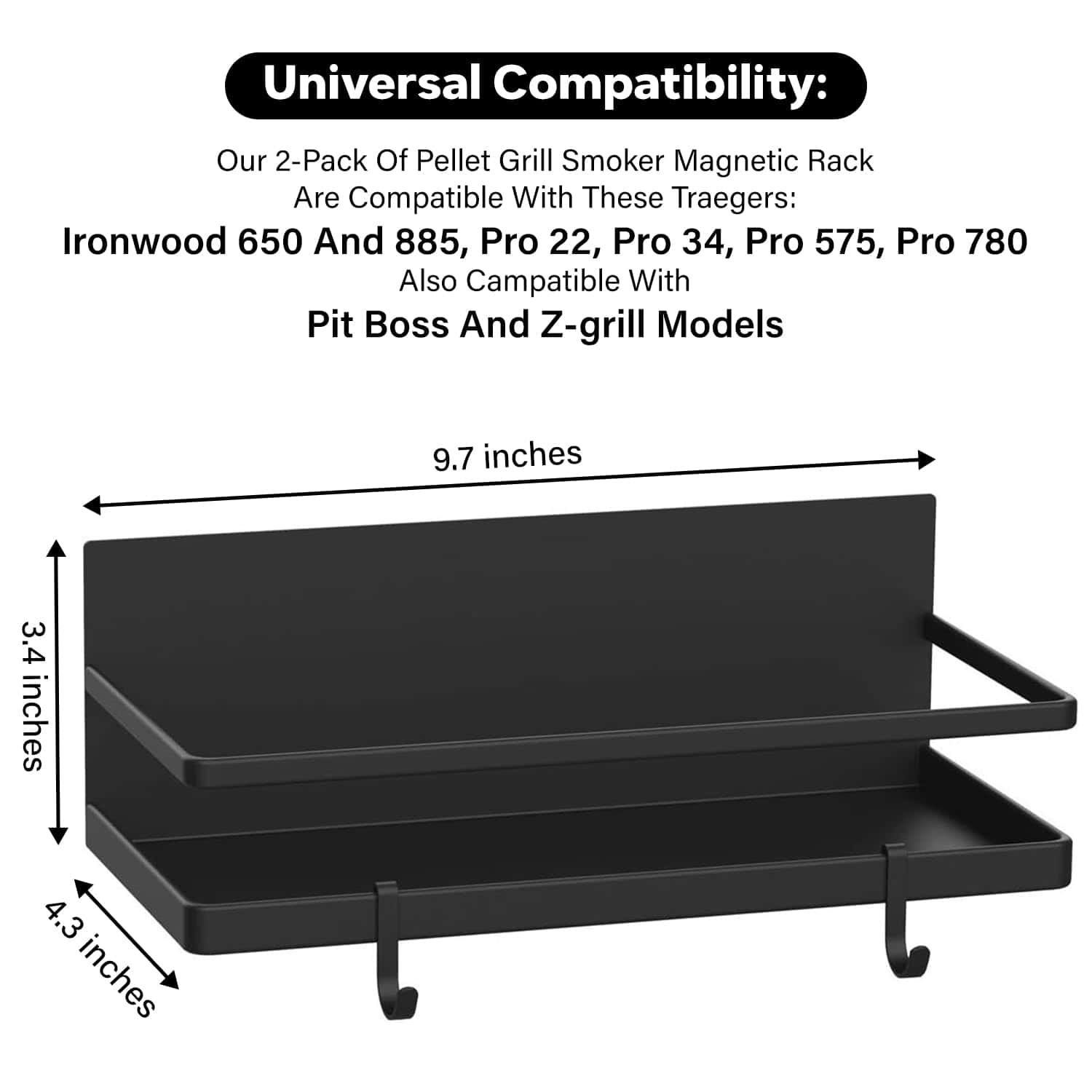 1. Compatibilidad universal: Nuestro paquete de 2 estantes magnéticos para parrilla de pellets es compatible con Traegers: Ironwood 650 y 885, Pro 22, Pro 34, Pro 575, Pro 780 – También compatible con modelos Pit Boss y Z-grill.