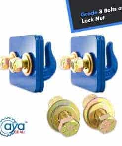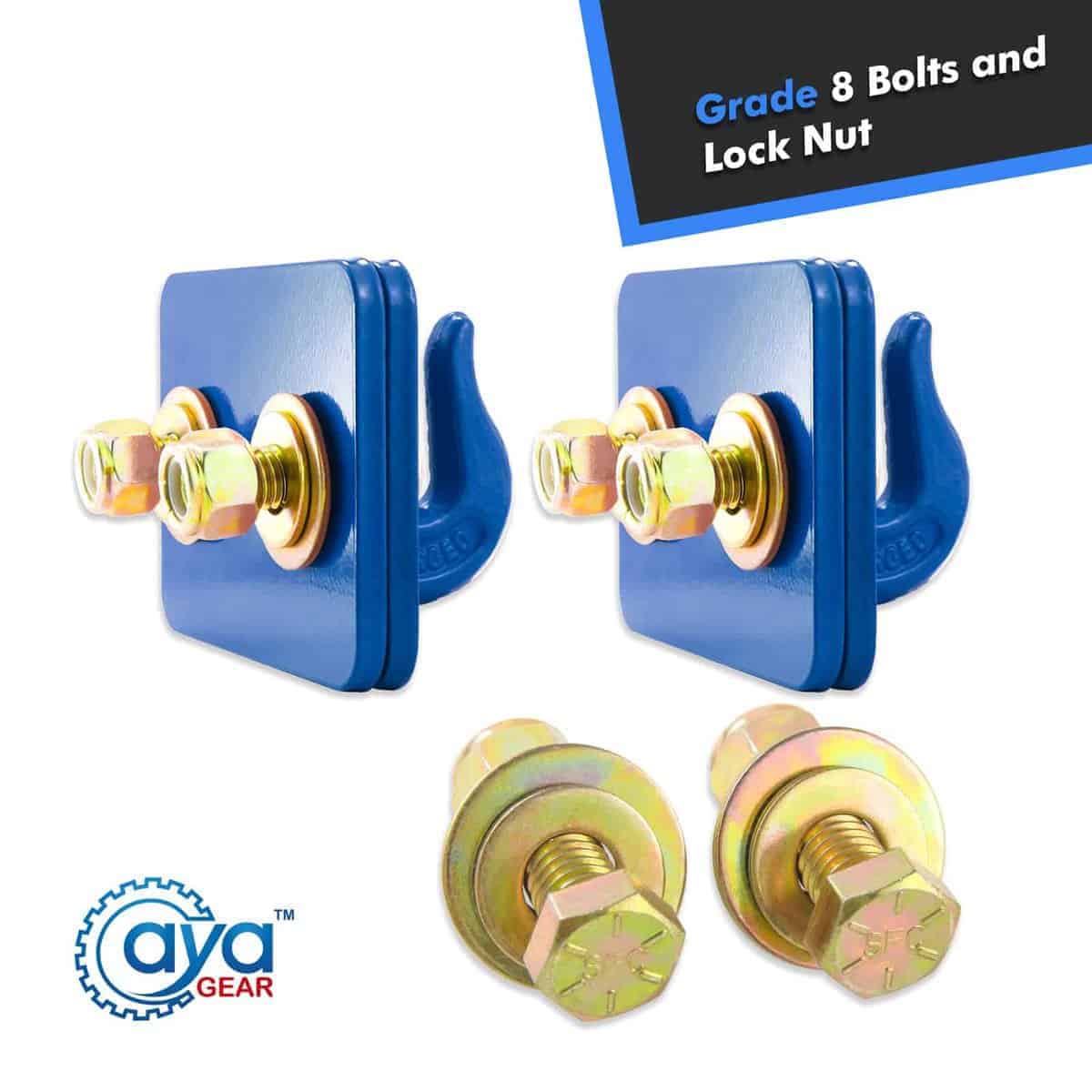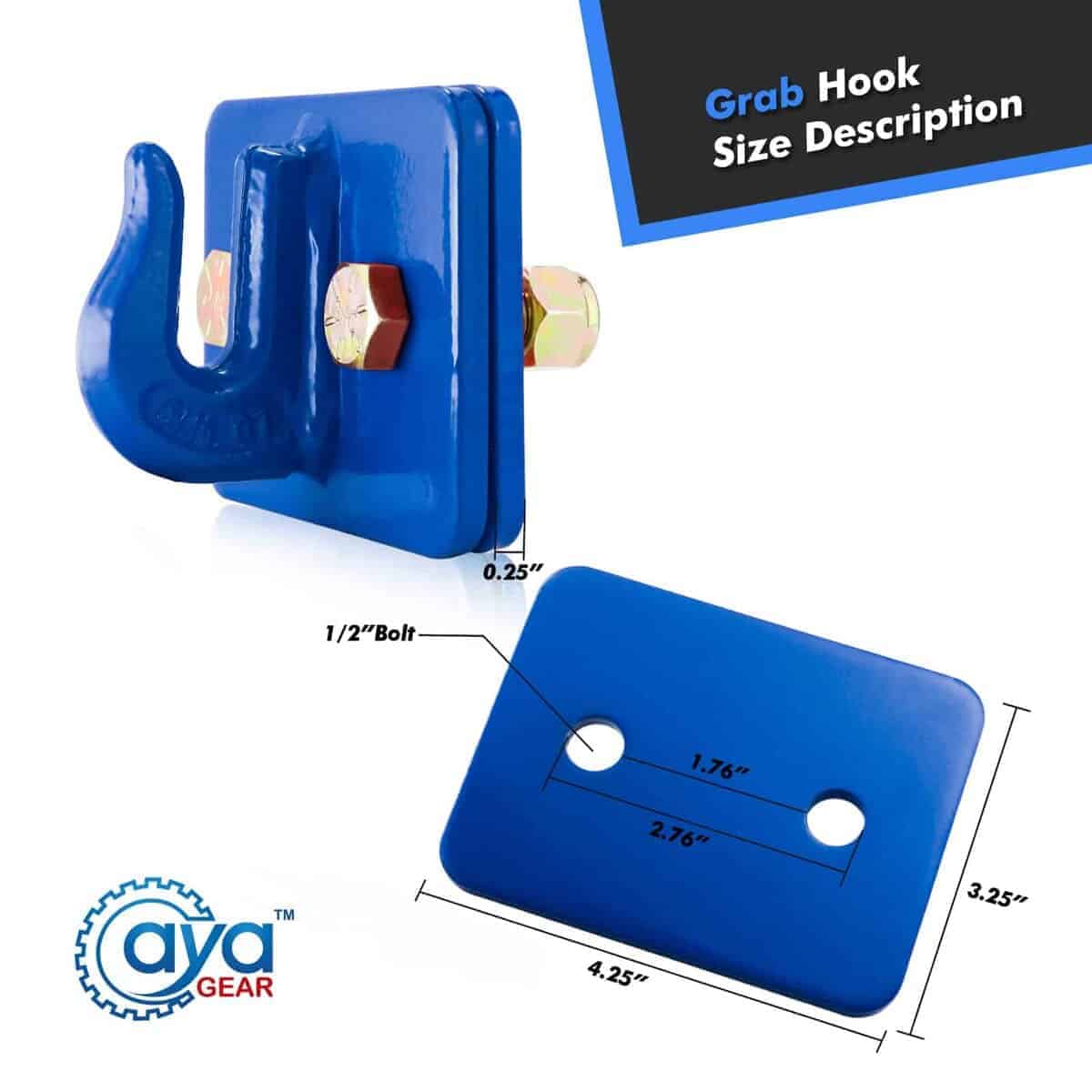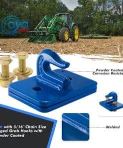 Los ganchos atornillables de G70 de AYA GEAR están soldados a una placa de 1/4″ e incluyen tuercas de Grado 8. Estos son perfectos para usar con cadenas G70 que se usan comúnmente con tractores utilitarios compactos de tamaño pequeño a mediano. Estos ganchos de agarre atornillables están galvanizados para evitar la oxidación.