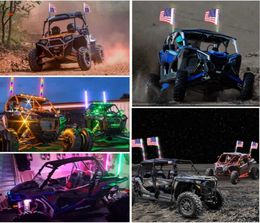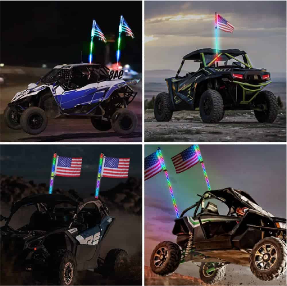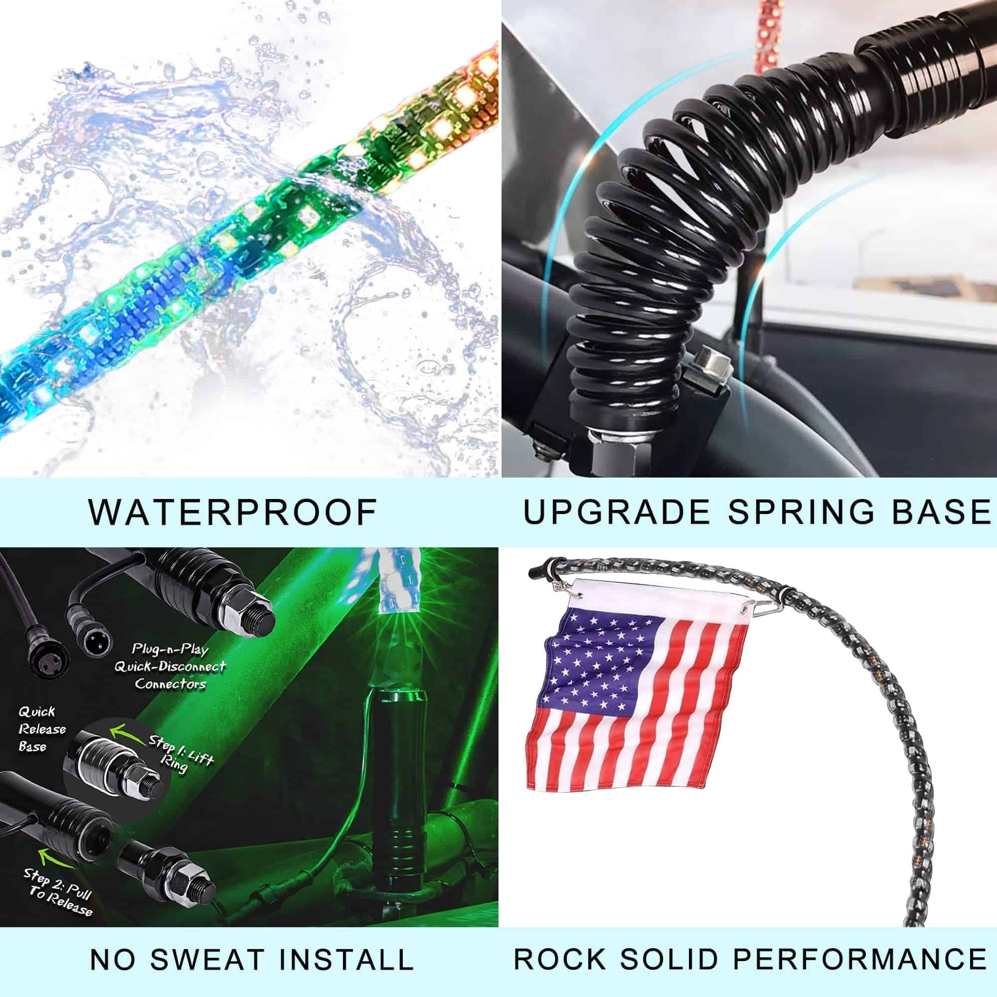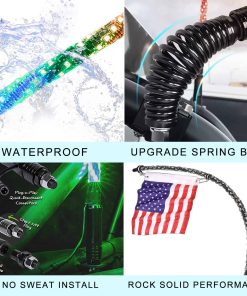 Ilumina la noche con nuestro paquete de 2 luces de látigo LED de 4 pies con control remoto de color RGB que ofrece una perspectiva de 360 grados. Con una amplia variedad de modos de baile como persecución, acumulación, estroboscópico, pulso, escaneo, apilamiento y 32 colores puros, nunca te aburrirás de las opciones. Este set incluye 2 luces de látigo LED de 4 pies, arnés de cableado plug and play y caja de control, control remoto, base de montaje de conexión/desconexión rápida y 2 bases de resorte resistentes, lo que lo convierte en una opción versátil para una variedad de vehículos como ATV, UTV, Polaris, RZR, Can Am, SxS, buggy de dunas, pista de arena, buggy de cuatro ruedas, kart, camioneta, equipo industrial y motocicleta. La instalación es fácil con la configuración plug and play y la base de desconexión rápida. Simplemente perfore un agujero para fijar la luz LED en su lugar, conecte el cable de alimentación y luego use el control remoto para controlarla. Además, ofrecemos 30 días de devoluciones y cambios gratuitos, 365 días de servicio de garantía gratuito y un servicio al cliente de alta calidad para su tranquilidad.