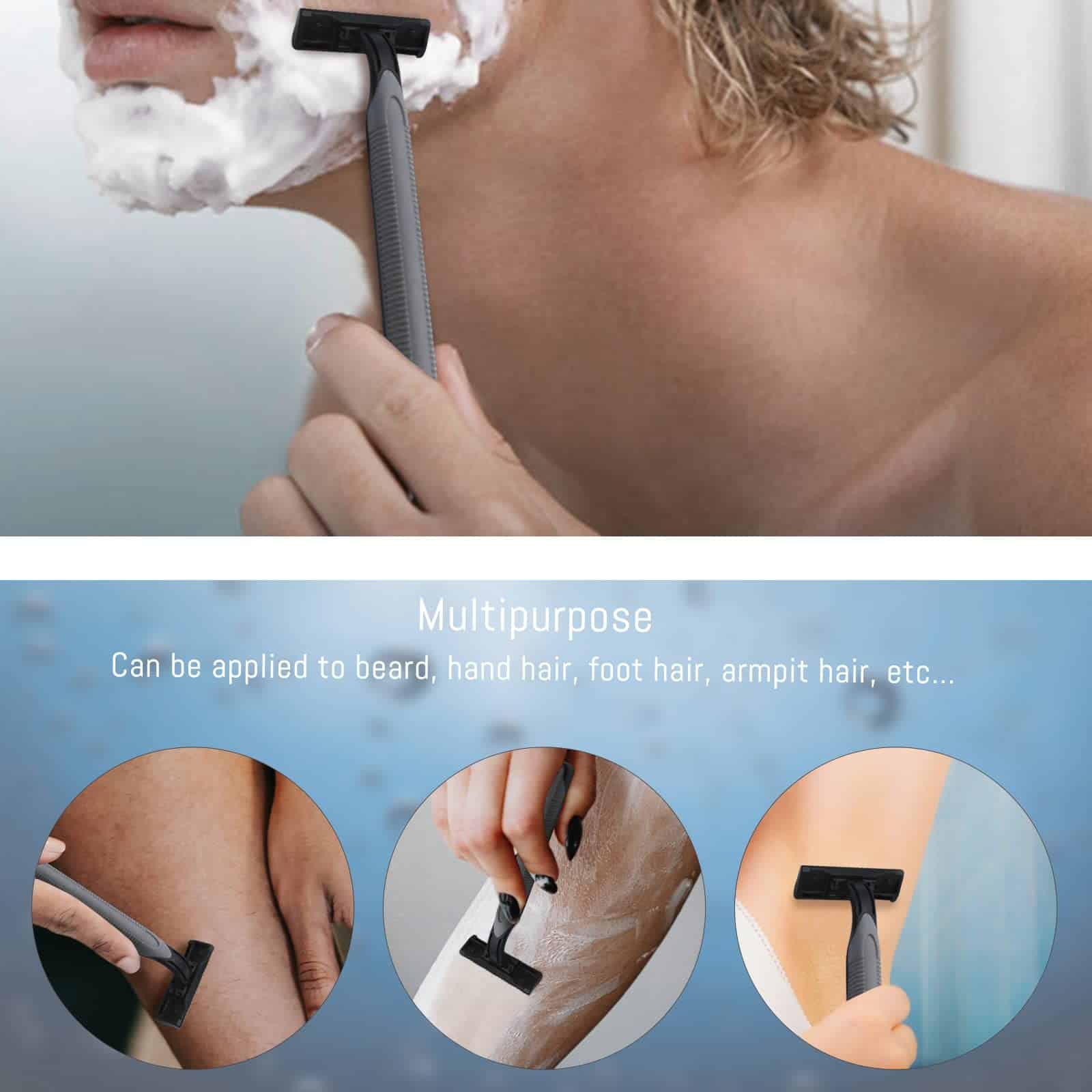 7. VERSÁTIL: versátil, adecuado para hombres y mujeres, esta rasuradora desechable para hombres se puede utilizar para una variedad de propósitos, en la cara o las piernas.
