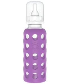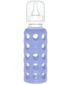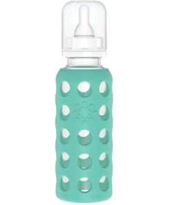 El biberón de 9 oz viene con una funda de silicona, tapa de polipropileno, anillo, tapón y una tetina de silicona de Etapa 2 (3-6 meses). Apreciarás la superficie antideslizante de la colorida funda de silicona, y te encantará el hecho de que estás utilizando un biberón de vidrio fabricado con materiales de alta calidad. Apto para lavavajillas (coloca las piezas de la tapa y la tetina en la rejilla superior/no es necesario quitar la funda de silicona a menos que se desee).