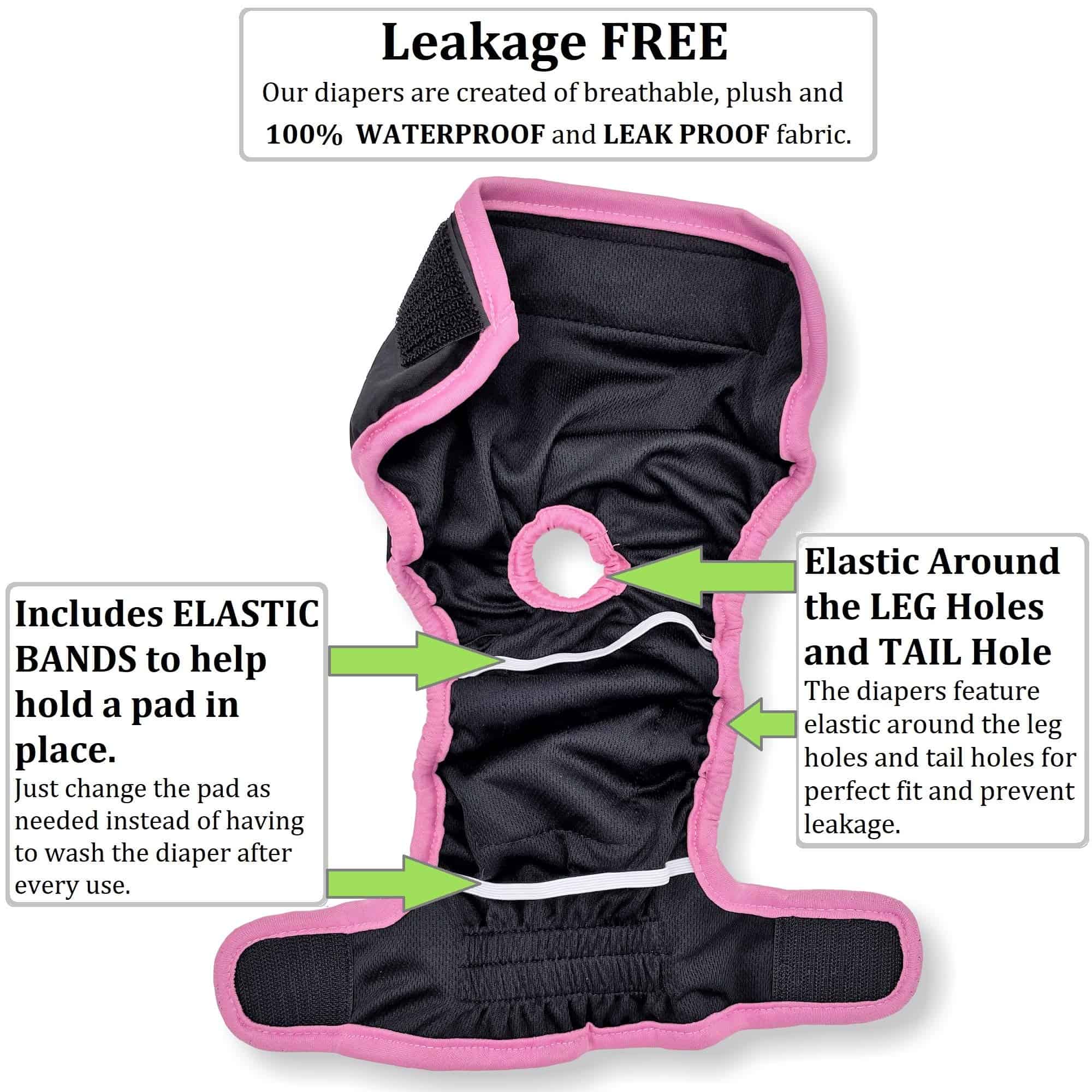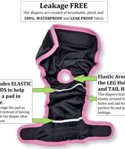 PAD PLACEMENT STRAPS- Nuestros pañales para perros hembra están diseñados con bandas elásticas para ayudar a mantener una almohadilla en su lugar. Funcionales para mascotas jóvenes sin entrenamiento, mascotas que sufren de incontinencia, edad o enfermedad. Malla en la capa interior para máxima comodidad y capa exterior 100% impermeable para evitar fugas.