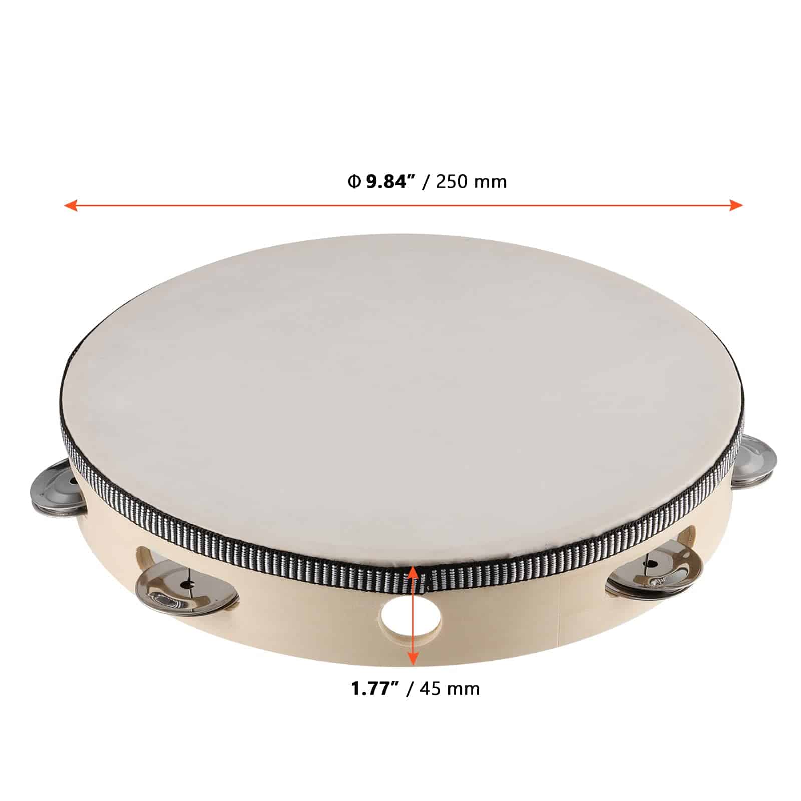 La campana del tamborín está muy bien construida y suena genial. Tiene un agujero en el lado por el que puedes meter tus dedos, o atar una cinta para sujetar el tamborín a algo.