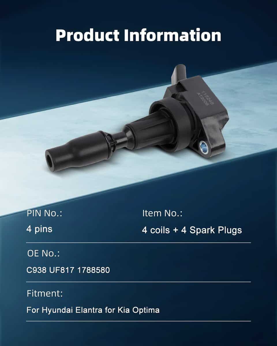 Paquete de 4 bobinas de encendido con 4 bujías de iridio UF817 para varios modelos de Hyundai y Kia. Las bobinas premium ECCPP y las bujías están construidas para alcanzar o superar las especificaciones originales del equipo. Proporcionan una alta conductividad de alambre de cobre y una alta vida útil con conexiones resistentes a la corrosión que garantizan una excelente conectividad eléctrica y una larga vida útil. Estas bobinas y bujías mejoradas proporcionan un 15% más de energía que las bobinas OE y mejoran el rendimiento del motor. Proporcionan chispa para su motor y garantizan un arranque en frío superior y un motor más suave. Tenga en cuenta que todas las referencias a marcas y modelos son solo para fines de compatibilidad y no implican ninguna afiliación o respaldo por parte del fabricante original.