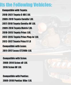 Reemplace las bobinas y bujías de su Toyota Corolla, Matrix, Prius, CT200h, IM, XD o Pontiac Vibe con este paquete de 4 bujías de platino de Autowxjq. Compatible con una variedad de modelos de 1.8L L4, estas bobinas de encendido y bujías cumplen o superan el diseño y rendimiento OE. El procedimiento de prueba riguroso garantiza su durabilidad y calidad superior. La bota de goma de silicona en las bobinas soporta extremas temperaturas para un aislamiento superior. Con una garantía de 12 meses, puede estar seguro de su compra. Asegúrese de confirmar la compatibilidad antes de ordenar y se recomienda reemplazarlas al mismo tiempo para evitar problemas de rendimiento del motor. ¡Ordene su paquete hoy y mantenga su vehículo funcionando sin problemas!