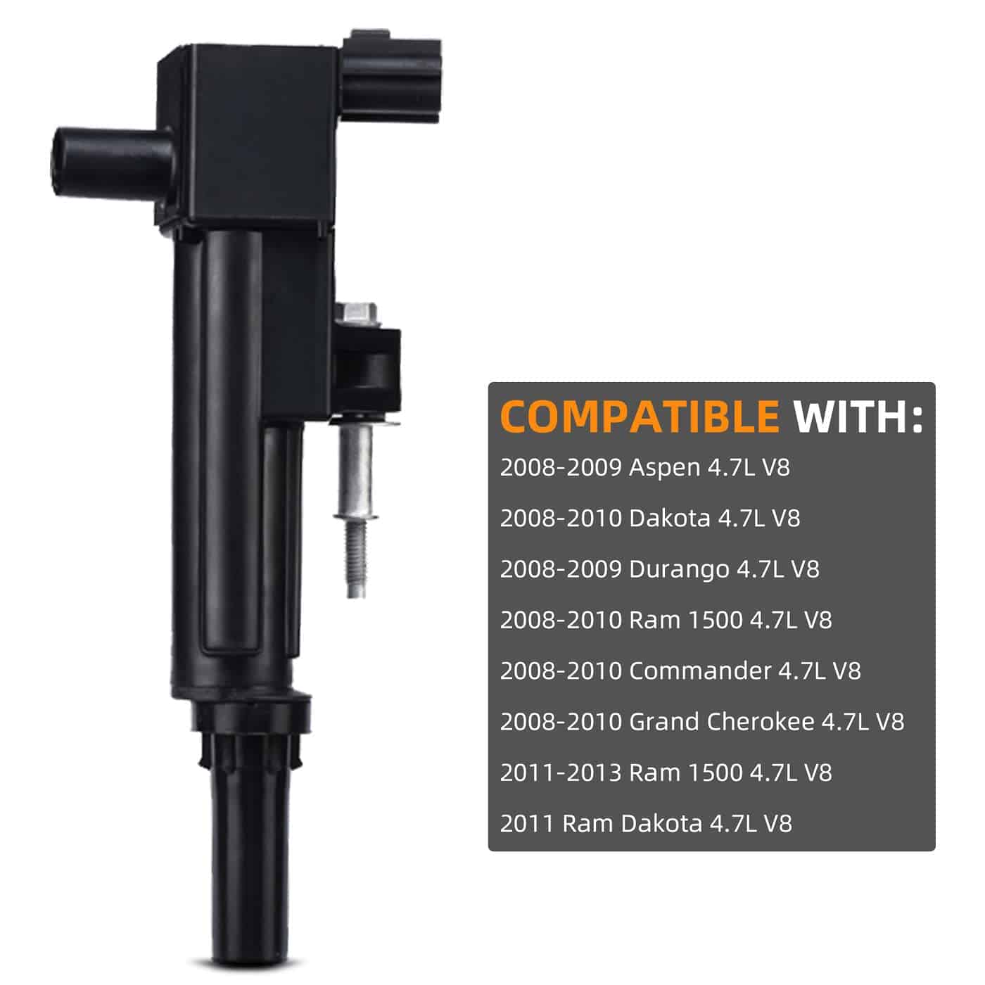 Compatibilidad: Aspen 4.7L V8 2008-2009 Dakota 4.7L V8 2008-2010 Durango 4.7L V8 2008-2009 Ram 1500 4.7L V8 2008-2010 Commander 4.7L V8 2008-2010 Grand Cherokee 4.7L V8 2011-2013 Ram 1500 4.7L V8 2011 Ram Dakota 4.7L V8. Incluido en el artículo: Paquete de 4 bobinas de encendido de alta energía. Materiales: Bobina: Alambre de cobre de alto rendimiento hecho en Alemania. Características: 100% Nuevo en Paquete Original de Fábrica. No son partes reacondicionadas o remanufacturadas. El producto se fabrica en instalaciones certificadas ISO 9000 / ISO 9001 / ISO 9002 y se ensambla al vacío para garantizar la calidad. Utilizamos alambre de cobre hecho en Alemania con maravillosa conductividad eléctrica para garantizar un rendimiento óptimo. Reemplazo directo. Fácil de instalar.