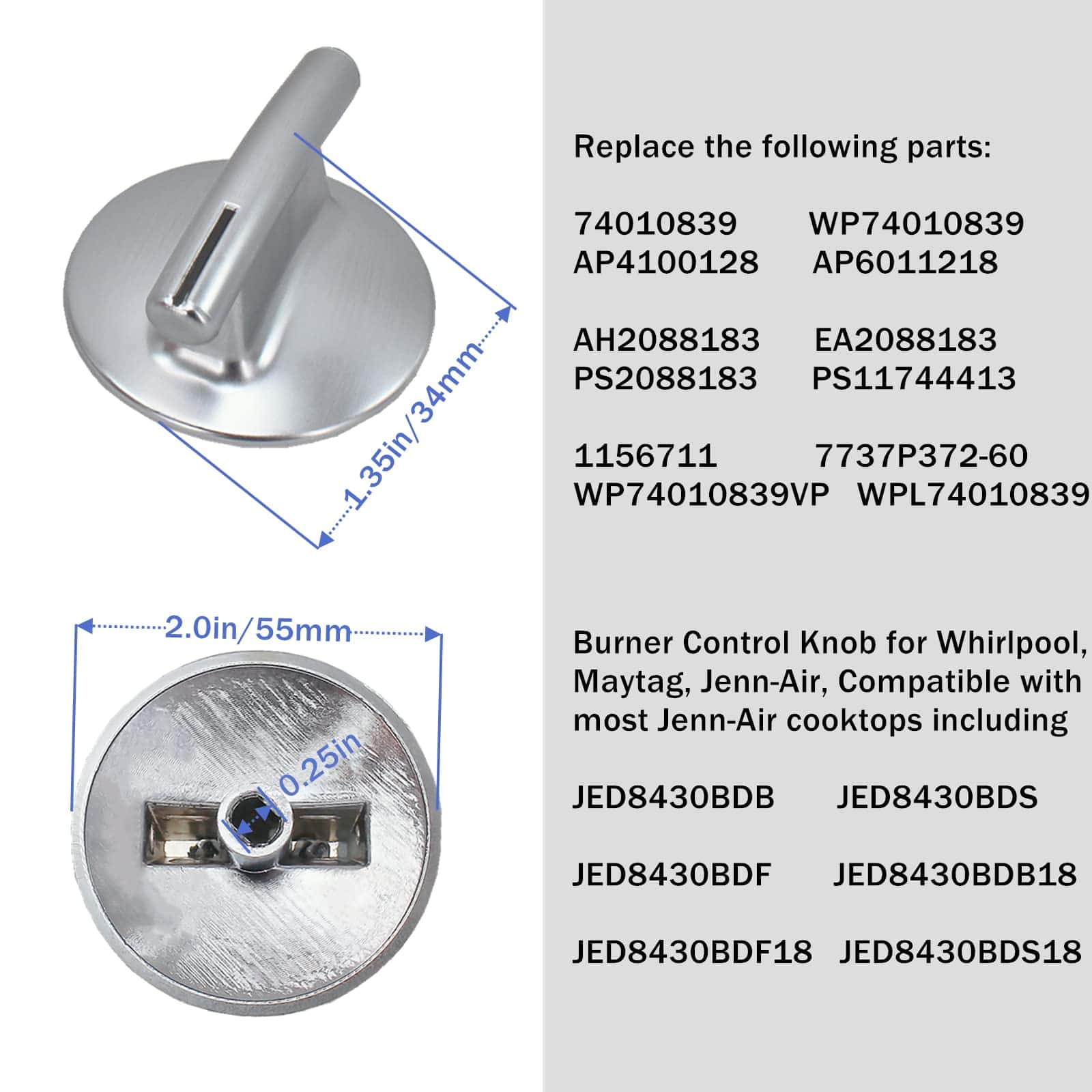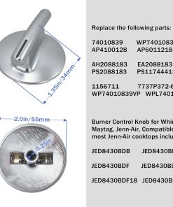 3. Reemplaza a las siguientes partes: 74010839, WP74010839, AP4100128, AP6011218, 1156711, 7737P372-60, AH2088183, EA2088183, PS2088183, PS11744413, WP74010839VP, WPL74010839. Perilla de control del quemador para Whirlpool, Maytag, Jenn-Air, compatible con la mayoría de los cocinetes Jenn-Air incluyendo JED8430BDB, JED8430BDS, JED8430BDF, JED8430BDB18, JED8430BDF18, JED8430BDS18.