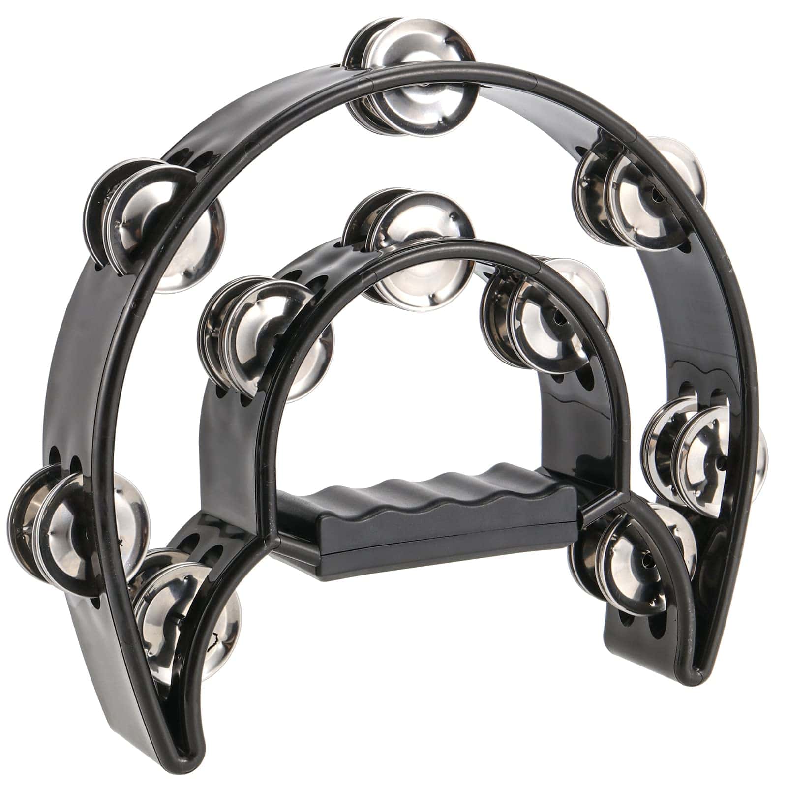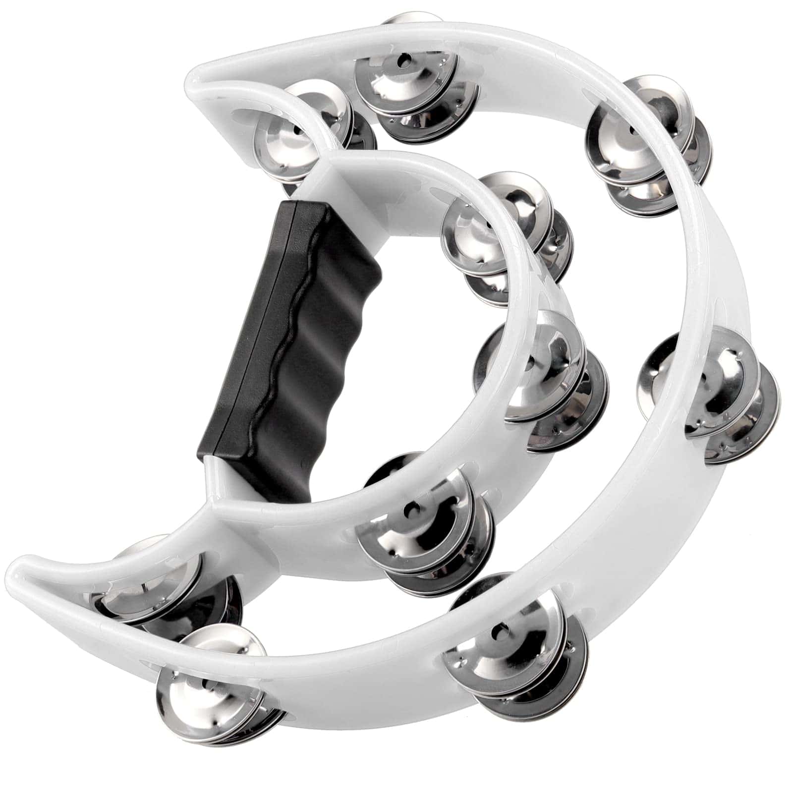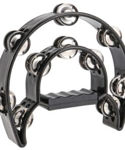 Este tamborin de media luna de mano es realmente resistente y bien hecho. Medio círculo con doble fila de placas y un mango ergonómico genial para sujetar fácil mientras tocas.