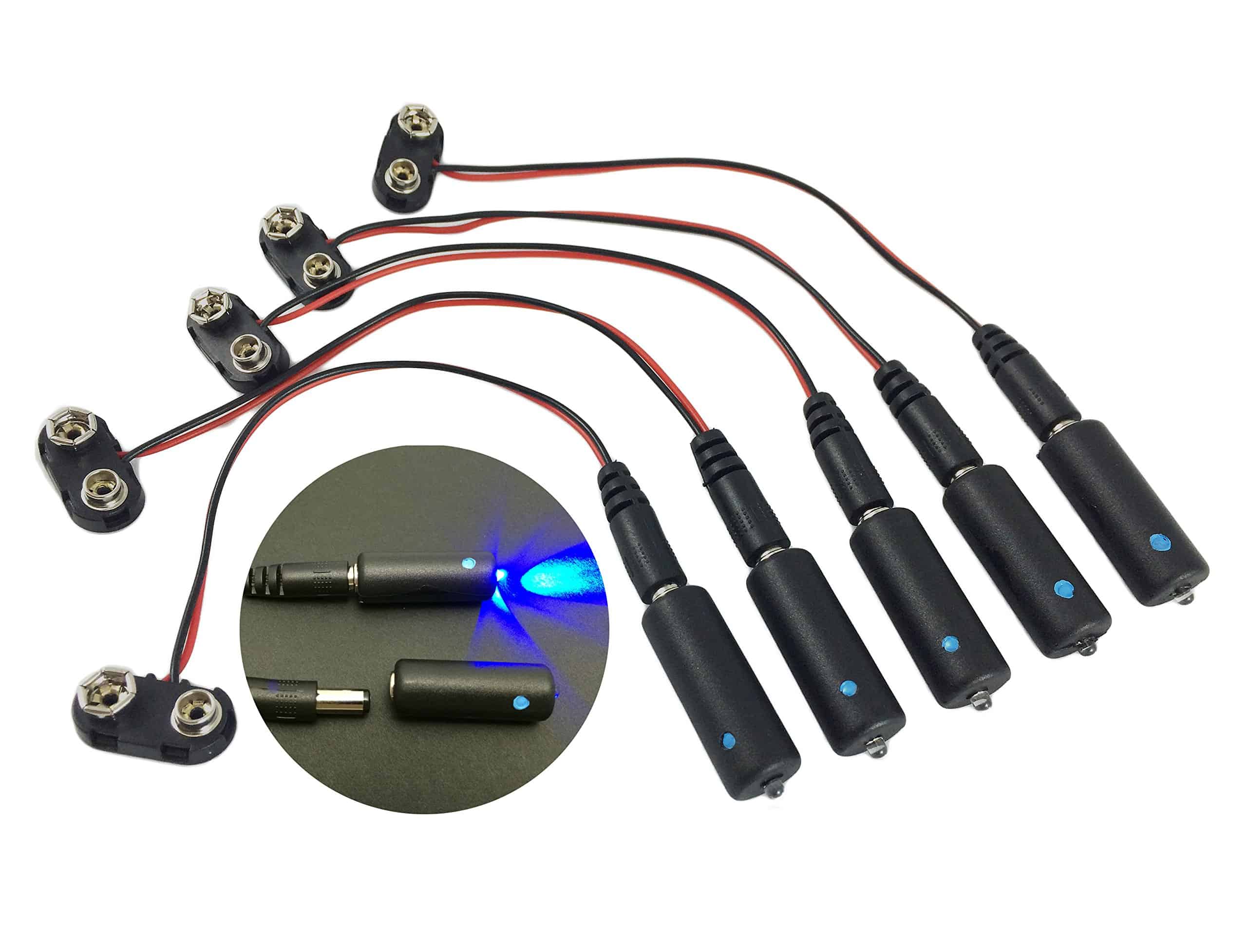 La luz MEL Micro Effects azul es una fuente de luz LED que cuenta con un conector tipo barril DC integrado. La cabeza cilíndrica LED azul utiliza un conector tipo barril de 2,1 x 5,5 mm para conectarla al arnés de cables incluido. Este arnés tiene un conector de barril en un extremo y un clip de batería de 9 voltios en el otro, lo que le permite funcionar con una batería de 9 voltios. El MEL está optimizado para una alta producción de luz a 9 voltios DC, con una potencia nominal de 0.18 vatios operando a 20 mA de referencia. Es ideal para diversas aplicaciones de iluminación LED, incluidos paisajes, accesorios, modelos, animatronics, robótica, efectos especiales y disfraces. Este kit incluye cinco luces MEL azules y cinco clips de batería de 9 voltios, cada uno con cables de 5 pulgadas de referencia. La longitud total de la luz y el clip combinados es de 8 pulgadas.