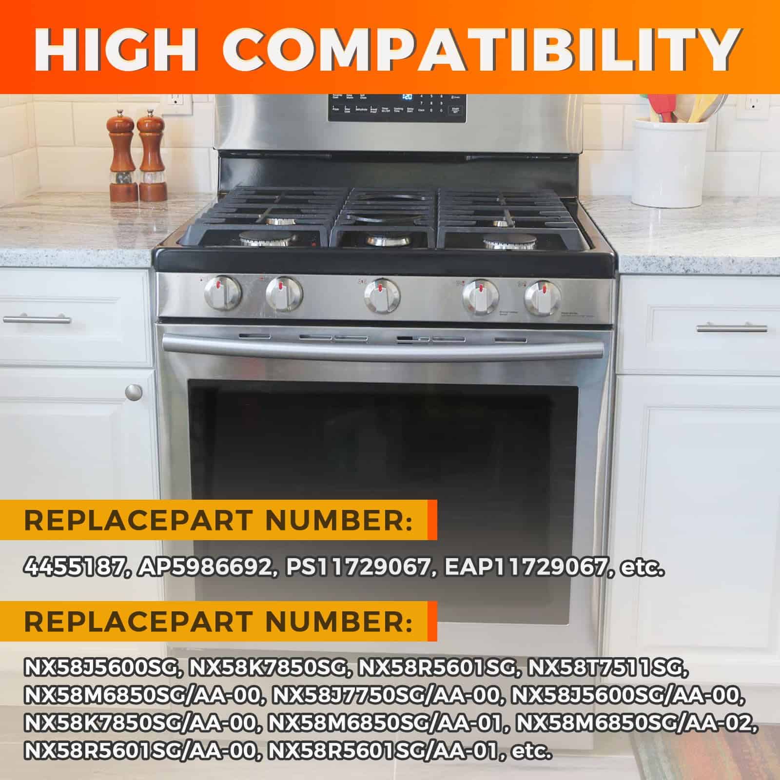 3. : Estas perillas de reemplazo para estufa de gas Samsung pueden reemplazar directamente los números de parte: DG64-00473A, DG64-00473B, 3447565, AP5917439, etc, y son compatibles con los modelos de estufa/horno de gas Samsung: NX58J5600SG/AA-00, NX58J7750SG/AA-00, NX58K7850SG/AA-00, NX58M6850SG/AA-00, NX58J5600SG/AA-01, NX58J7750SG/AA, NX58R5601SG/AA-00, NX58M6850SG/AA-02, etc.