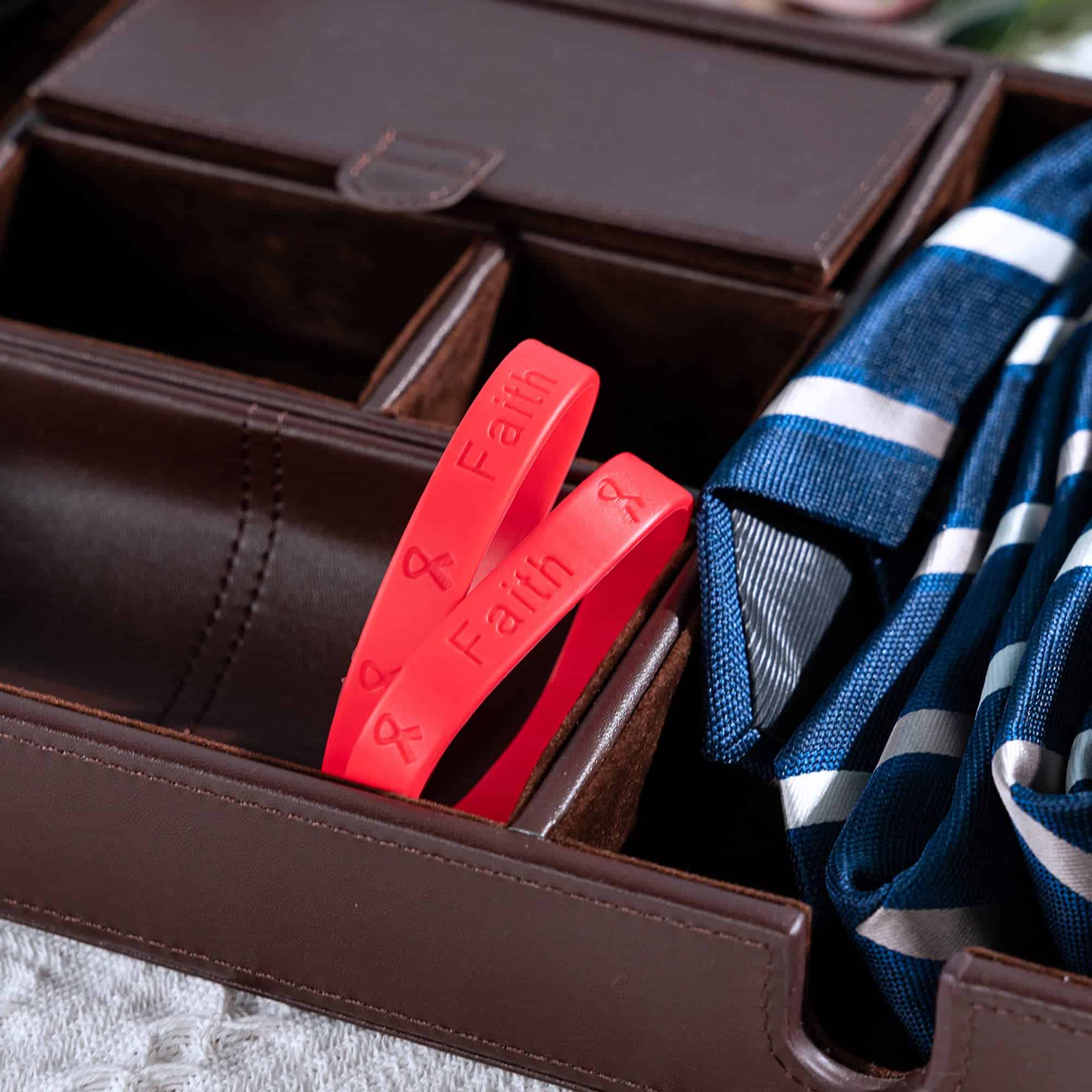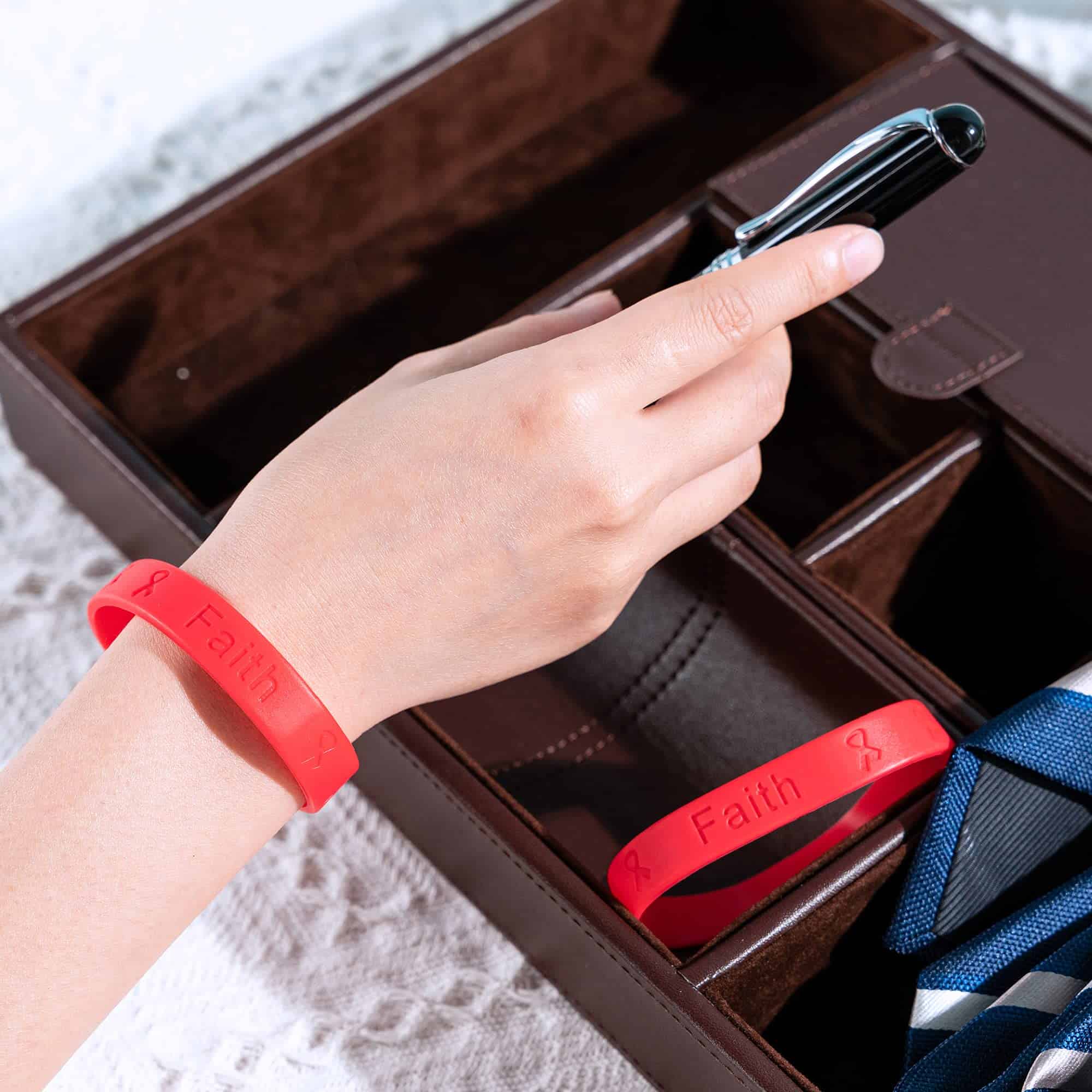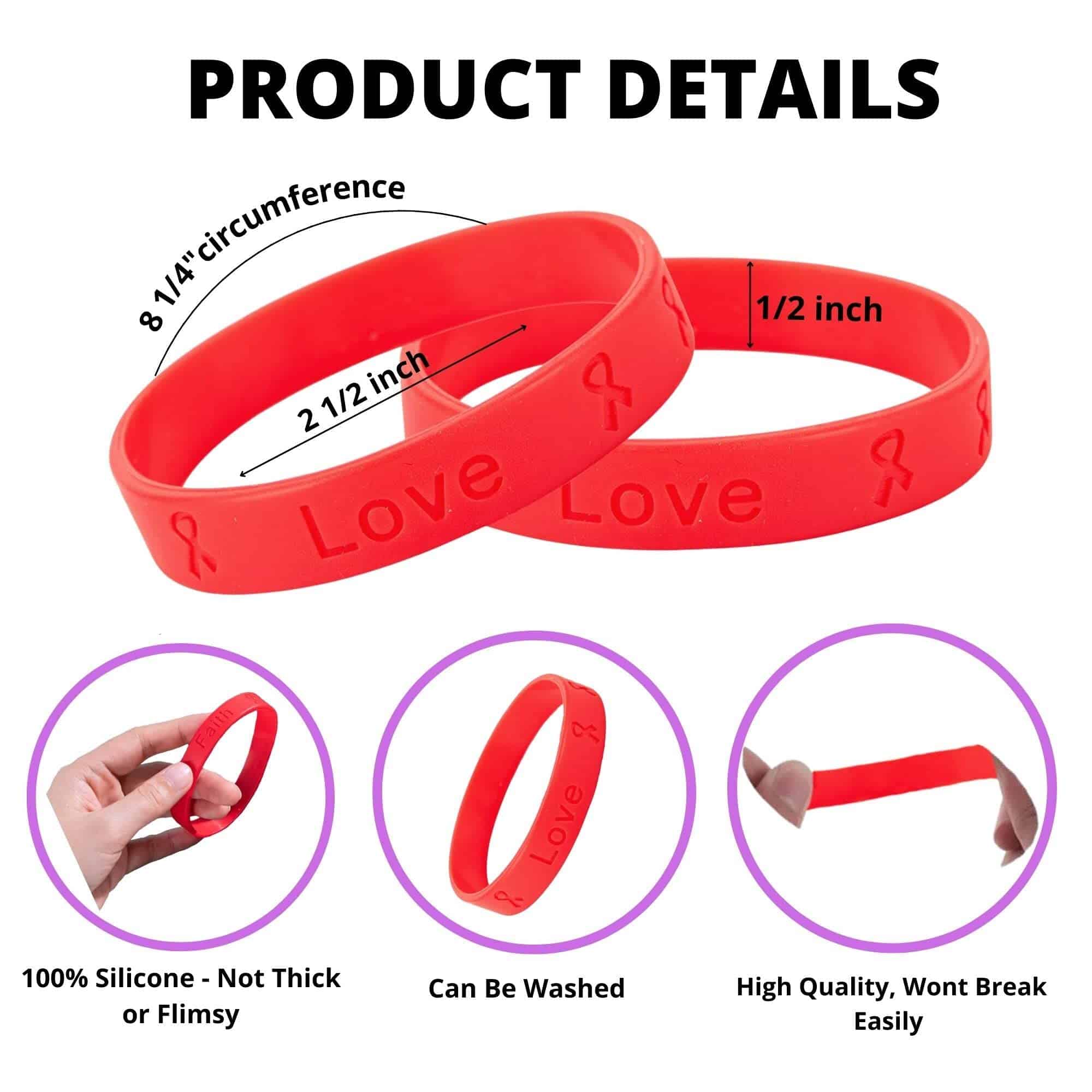 Este paquete de 50 nuevas pulseras de conciencia con cinta roja que representan muchas enfermedades y causas diferentes te ayudarán a ti y a tus amigos a mostrar tu apoyo con estilo. Hay muchas causas que son representadas por la cinta roja de conciencia como el SIDA, VIH, enfermedades cardíacas, anemia aplásica, enfermedad cardiovascular, abuso de drogas, presión arterial alta, hipertensión, accidente cerebrovascular y abuso de sustancias. Estas pulseras motivacionales están diseñadas para ser una elegante y estilizada pulsera de conciencia roja para usar en cualquier ocasión. Con nuestras pulseras de silicona roja, puedes mostrar tu apoyo simplemente usando una de estas pulseras. Cada pulsera de cinta está hecha para adaptarse cómodamente sin restringir el flujo sanguíneo. Cada pulsera roja está hecha de silicona de alta calidad, no tóxica y ecológica al 100%. Estos paquetes de pulseras al por mayor son de tamaño adulto, miden 8 1/4 pulgadas de circunferencia y tienen la inscripción «Esperanza, Fe, Amor» en el exterior. Fundraising For A Cause fue fundada en 2005 después de que la hermana de nuestra fundadora, Karen Conroy, fuera diagnosticada con cáncer de mama. Ella vio cuántas personas y organizaciones luchaban para recaudar dinero y conciencia para diferentes causas. Se le ocurrió la idea de vender productos de conciencia como una forma de generar dinero para estas organizaciones. Nuestro almacén de vanguardia de 15,000 pies cuadrados ubicado en Tampa, FL está abastecido con más de 6,500 productos de conciencia.