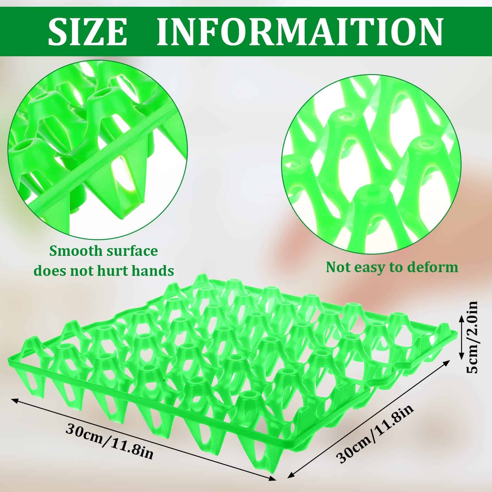 Especificaciones Nombre: Bandejas de plástico para huevos Material: Plástico Tamaño: 11.81 x 11.81 x 2 pulgadas Color: Verde Contenido del paquete 6 Bandejas de plástico para huevos (verdes) Escenario de aplicación Cartones de huevos de plástico adecuados para el almacenamiento y transporte de huevos para los granjeros de pollos Nota Dado que las dimensiones anteriores se miden manualmente, es posible que el tamaño real del artículo que reciba sea ligeramente diferente de las dimensiones anteriores