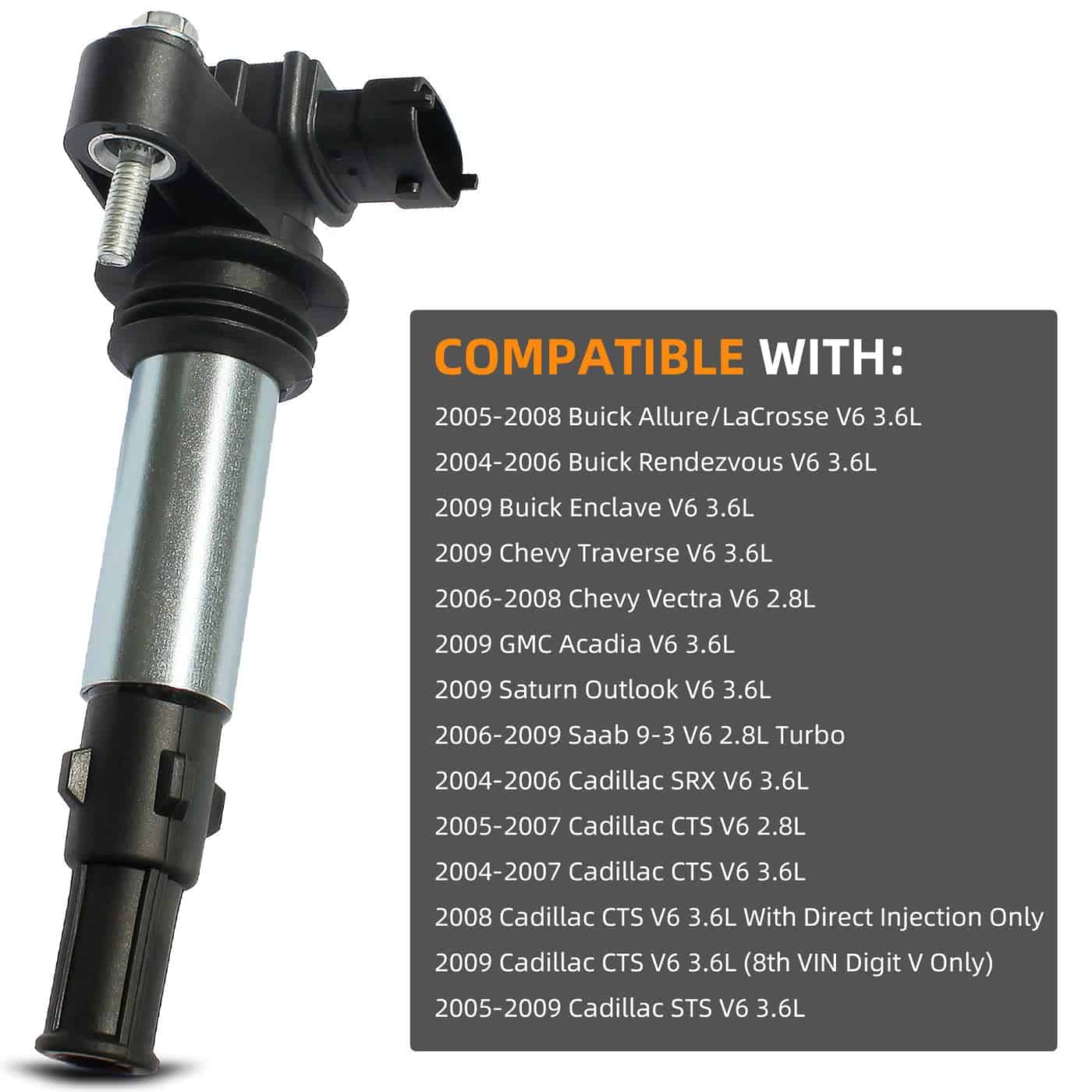 Paquete de 6 bobinas de encendido que son compatibles con una variedad de modelos de vehículos, incluidos Allure, LaCrosse, Rendezvous, Enclave, Traverse, Vectra, Acadia, Outlook, 9-3, SRX, CTS y STS con motores V6 de 2.8L y 3.6L. Estas bobinas de encendido reemplazan directamente los números de parte D501C, D510A, E383, E405, IC505, C1508, C1645, 52-1816, 5C1551, 1788489, 12566569, 12583514, 12613051, 12613057, 12629037, 00128. Fabricadas con alambre de cobre de ingeniería de precisión, estas bobinas ofrecen un rendimiento premium, durabilidad y operación confiable. Diseñadas para mejorar la eficiencia de encendido, pueden contribuir a una mejor economía de combustible, una operación del motor más suave y una vida útil más larga. Asegúrese de verificar la compatibilidad del vehículo antes de realizar la compra. Incluye un paquete de 6 bobinas de encendido OEM con garantía ilimitada de 2 años en millas.