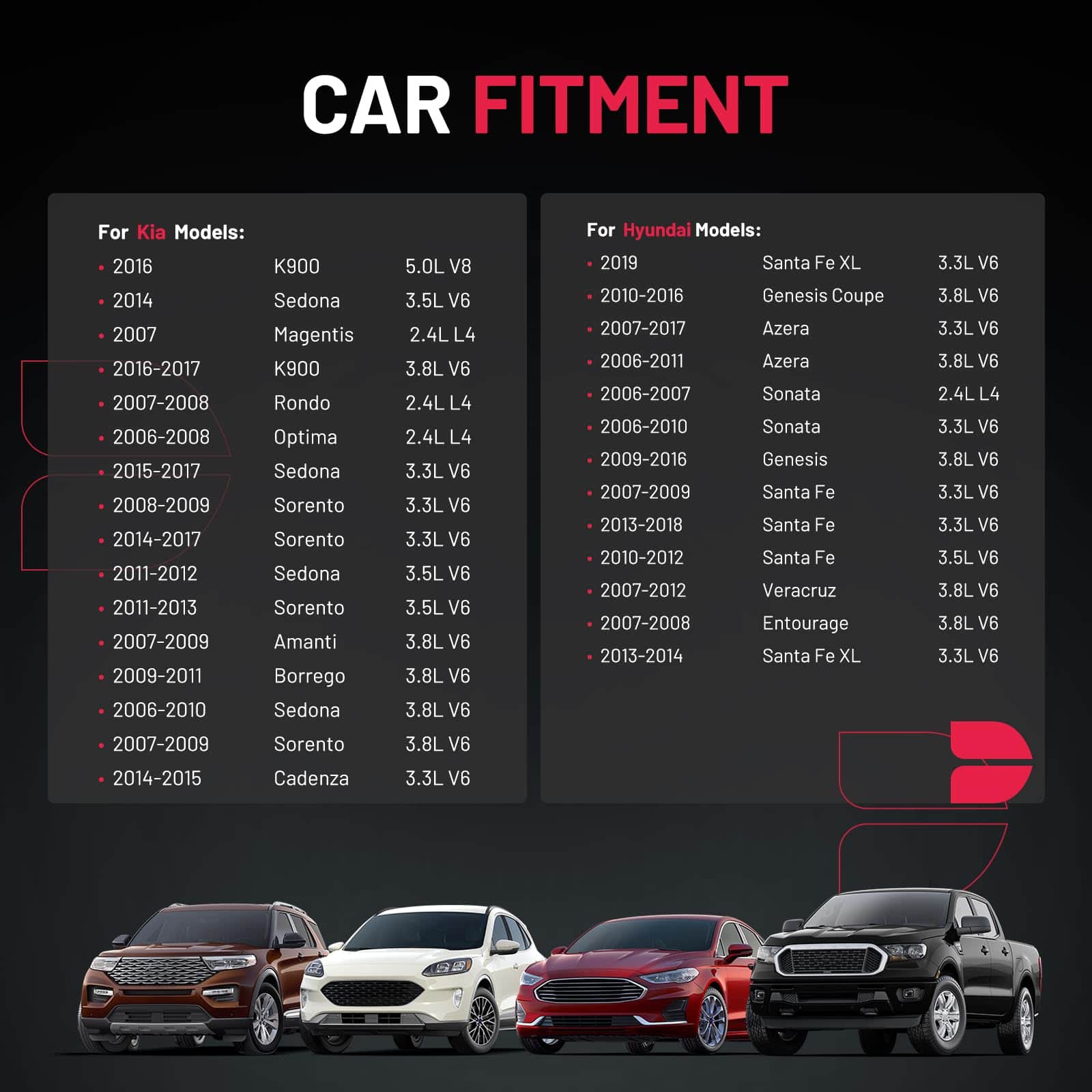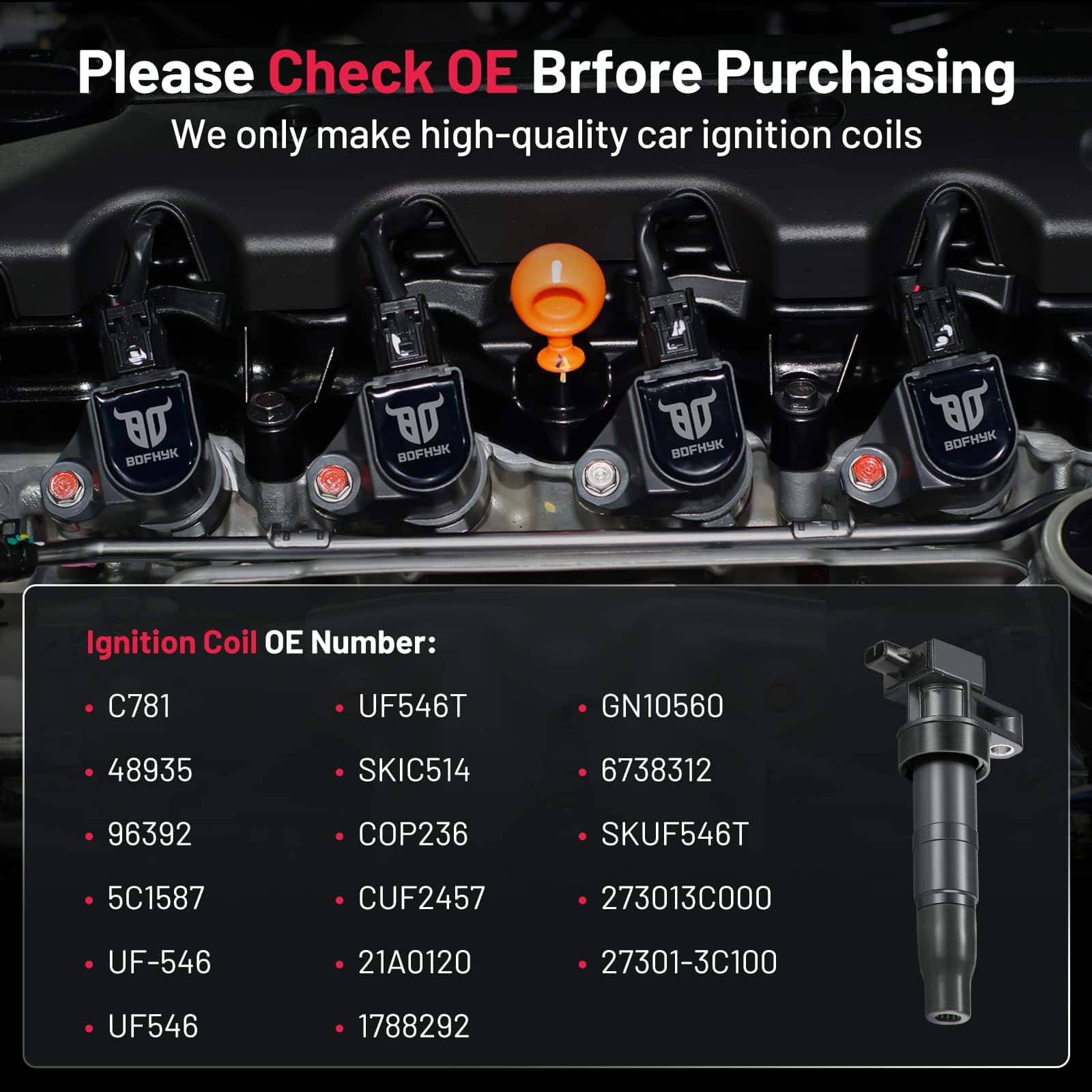 1. REDUCE LOS PROBLEMAS COMUNES DE LAS BOBINAS DE ENCENDIDO, como; arranque difícil o inexistente, tiempo de arranque prolongado, fallos de encendido, falta de potencia, cambios inconsistentes de transmisión, ensuciamiento de bujías, fallo prematuro del convertidor catalítico, mala economía de combustible, iluminación de la luz de revisión del motor. 2. REPUESTO DIRECTO/MEJORA – Sobre tus bobinas de stock originales. Solo utilizamos materiales de la más alta calidad. Esto hace que nuestro producto sea duradero y confiable en condiciones extremas, al mismo tiempo que proporciona Resistencia Eléctrica Alta, chispa fuerte en las bujías y es resistente a la corrosión y abrasión. 3. NÚMEROS DE PARTE COMPATIBLES – 27301-3C000, 27301-3C010, 27301-3C100, 273013C000, 273013C010, 273013C100, UF-546, UF546, UF546T, SKIC514, C781, CUF2457, COP236, 5C1587, 96392, GN10560, 21A0120, 1788292, 48935, 6738312, SKUF546T. 4. ALTA CALIDAD – ISO/TS 16949 CALIFICADO – Nuestras bobinas de encendido son probadas y cumplen o exceden los requisitos de rendimiento OEM. Comprar una bobina de encendido BDFHYK puede ahorrarle de $50 a $102 en tiendas de autopartes de EE. UU. 5. COMPATIBLE CON – 2019 Hyundai Santa Fe XL, 2010-2018 Hyundai Santa Fe, 2006-2017 Hyundai Azera, 2015-2017 Kia K900, 2014-2017 Kia Sedona, 2011-2017 Kia Sorento, 2009-2016 Hyundai Genesis, 2010-2016 Hyundai Genesis Coupe, 2014-2015 Kia Cadenza, 2007-2012 Hyundai Veracruz, 2009-2011 Kia Borrego, 2006-2010 Hyundai Sonata, 2007-2009 Kia Amanti, 2007-2008 Hyundai Entourage, 2006-2008 Kia Optima, 2007 Kia Magentis, 2013-2014 Hyundai Santa Fe XL. Más información se puede encontrar en las imágenes o en la página de detalles.