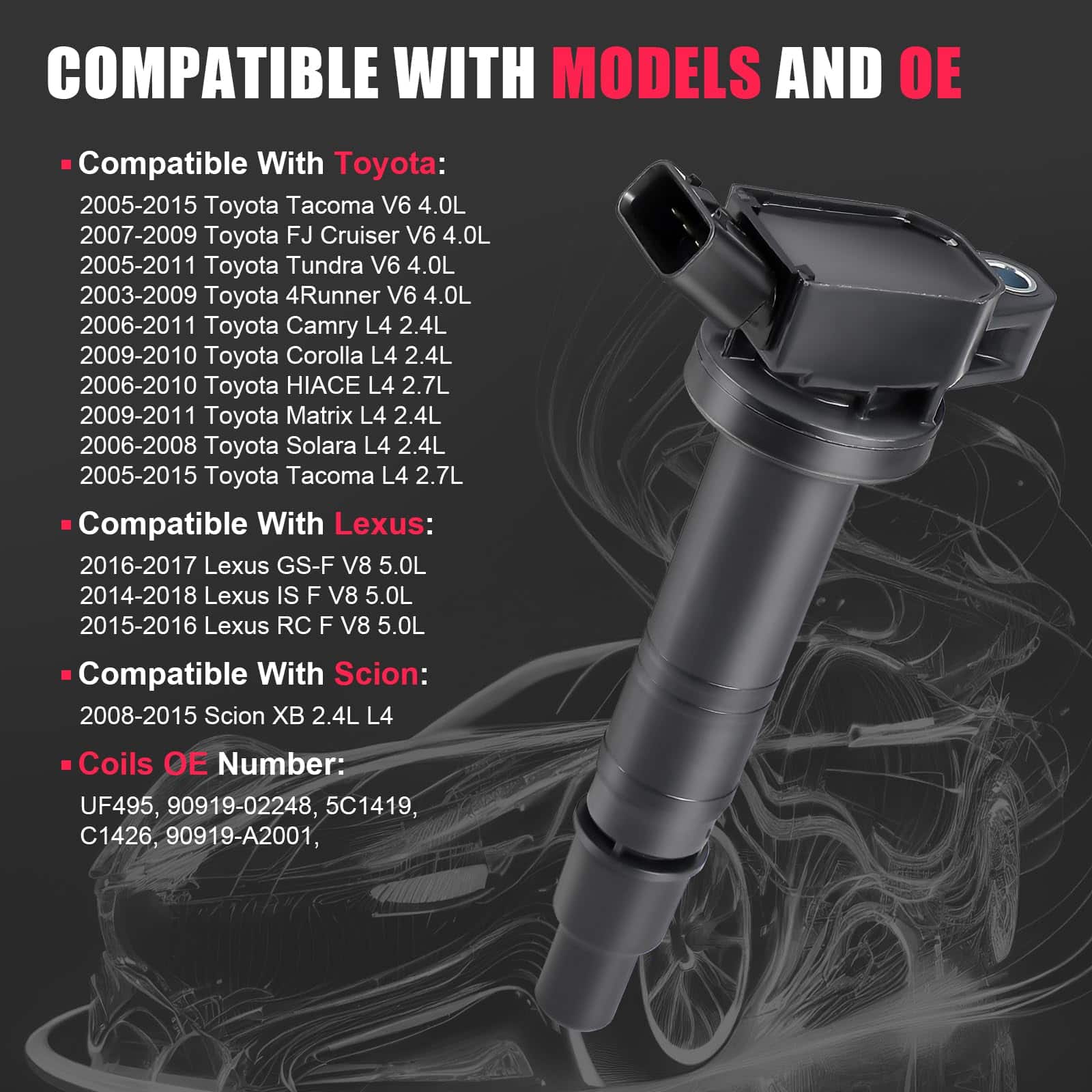 1. Compatible con: Paquete de bobinas de encendido para: 2005-2015 Toyota Tacoma 4.0 V6 | 2003-2009 Toyota 4Runner 4.0L V6 | 2007-2009 Toyota FJ Cruiser 4.0L V6 | 2005-2011 Toyota Tundra 4.0 V6, etc. Para una comprensión más detallada, consulta la Descripción del Producto.