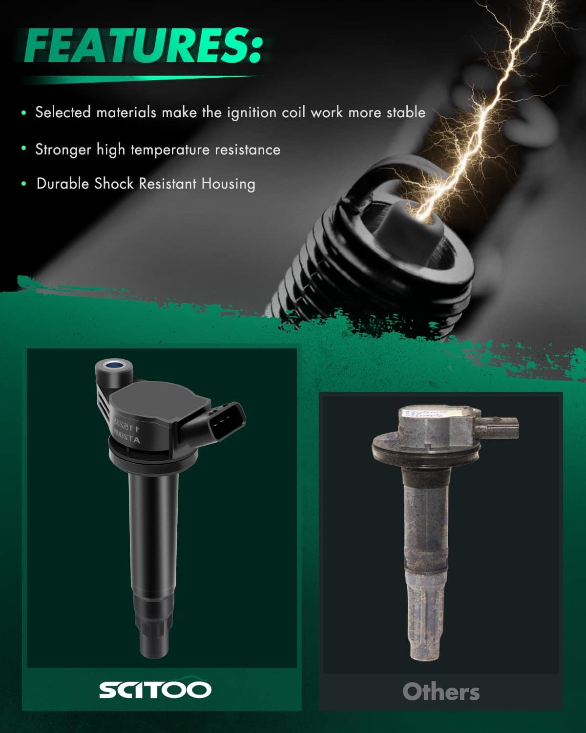 Paquete de 6 bobinas de encendido SCITOO diseñado para ser compatible con varios modelos de Toyota y Lexus con motores de 3.3L fabricados entre 2004 y 2008. Estas bobinas de encendido son un reemplazo perfecto para los vehículos mencionados, convirtiendo la electricidad de baja tensión en una chispa de alta tensión para encender la mezcla de gas combustible en el motor.