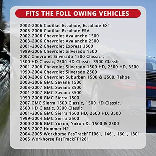 Compatible con los siguientes vehículos GM V8 con motores Vortec: Cadillac Escalade 2002-2006, Escalade EXT 2003-2006, Escalade ESV 2002-2006, Chevrolet Avalanche 1500 2002-2006, Avalanche 2500 2003-2006, Express 3500 2001-2002, Silverado 1500 1999-2006, Silverado 1500 Classic 2007, Silverado 1500 HD Classic, 2500 HD Classic, 3500 Classic 2007, Silverado 1500 HD 2001-2006, Silverado 2500 1999-2004, Suburban 1500 y 2500 2000-2006, Tahoe 2000-2006, Savana 1500 2003-2006, Savana 2500 2003-2007, Savana 3500 2001-2007, Sierra 1500 1999-2006, Sierra 1500 Classic 2007, Sierra 1500 HD Classic, 2500 HD Classic, 3500 Classic 2007, Sierra 1500 HD 2001-2006, Sierra 2500 1999-2004, Yukon y Yukon XL 1500 y 2500 2000-2006, Hummer H2 2003-2007, Workhorse FasTrack FT1061, 1461, 1601, 1801 2004-2005, Workhorse FasTrack FT1261. Características clave: Material de construcción robusto. Se puede instalar directamente sin modificaciones. Arranque rápido, rendimiento del motor estable y eficiencia de combustible optimizada. Cobre de alta calidad y aisladores aseguran la disponibilidad de alto voltaje para un rendimiento máximo. Pruebas de ciclos de choque térmico para garantizar la fiabilidad en todas las condiciones de la carretera. Paquete incluye: Juego de 8 Bobinas de Encendido de Rendimiento Premium. ¡Elige la Diferencia de Encendido ADICHRIS! Nuestros productos pueden ayudarte a resolver los siguientes problemas con tu vehículo: 1. Fallo del vehículo 2. Mala aceleración, exceso de vibración o pérdida de potencia 3. Aumento del consumo de combustible.