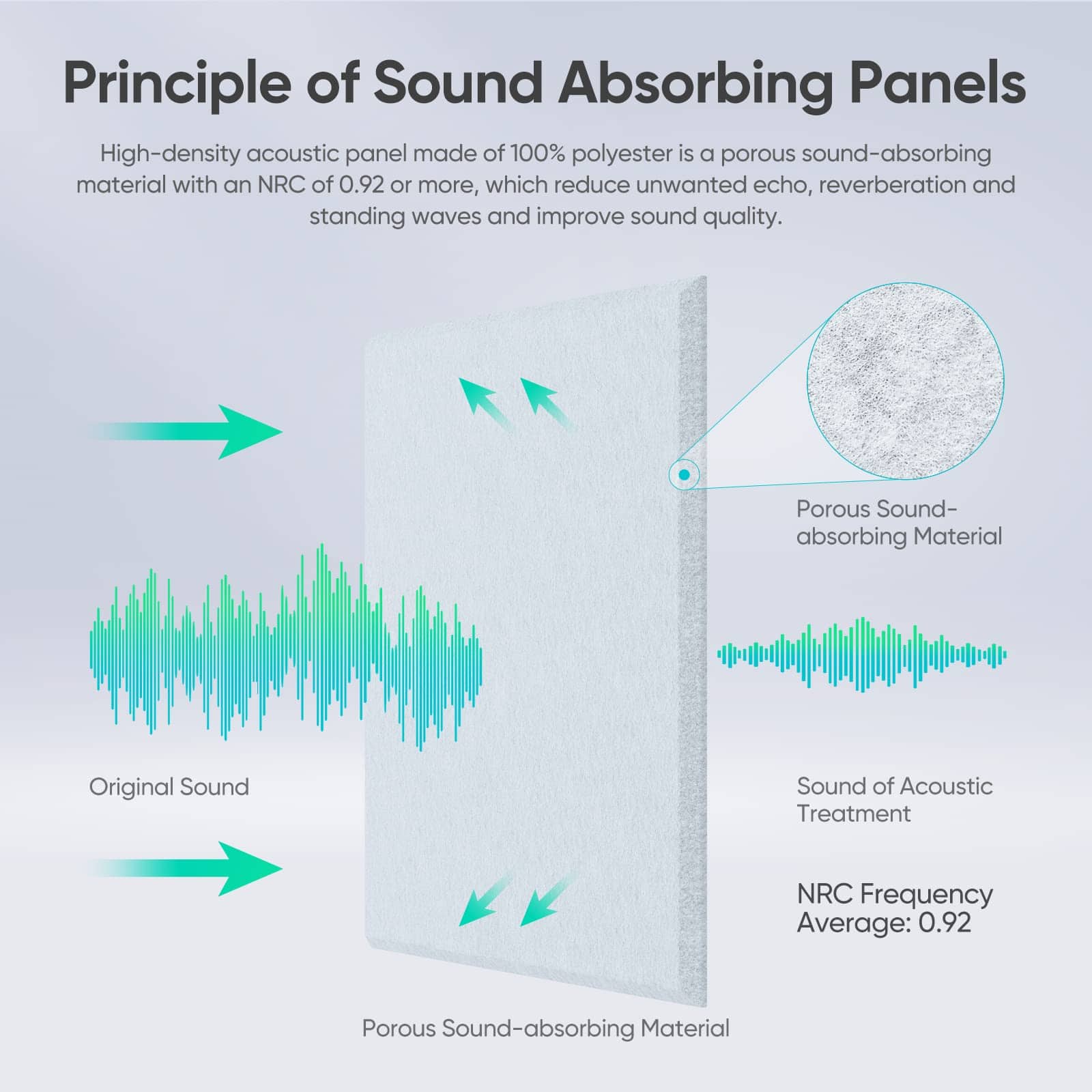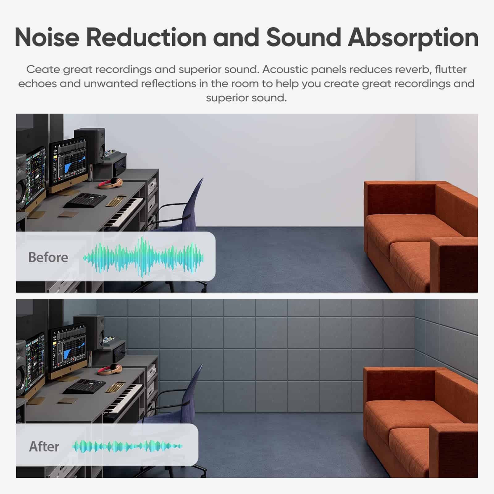 Fabricados con material acústico premium de fibra de poliéster 100%, los paneles de espuma son seguros y no tóxicos. Además, son retardantes de llama, lo que los hace adecuados para una variedad de entornos, incluidos estudios de grabación, cabinas vocales, salas de juego, salas de control, cines en casa y oficinas.