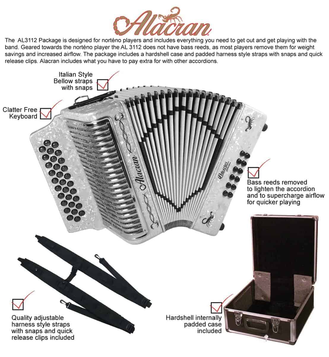 El paquete de acordeón Alacran AL3112 incluye un acordeón de 31 botones, 12 bajos diatónico sin rejillas de bajo. El acordeón cuenta con un diseño patentado de teclado de tocar suave y sin ruido, correas de fuelle de estilo italiano con broches ocultos y una correa lateral de bajo ajustable. Cada paquete incluye un juego de correas de hombro de estilo arnés y un estuche rígido. También disponible en Blanco Perla, Rojo Perla o Negro Brillante. Teclas disponibles: Sol/GCF, Fa/FBE o Mi/EAD.