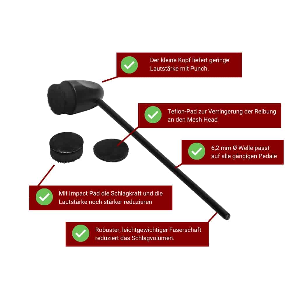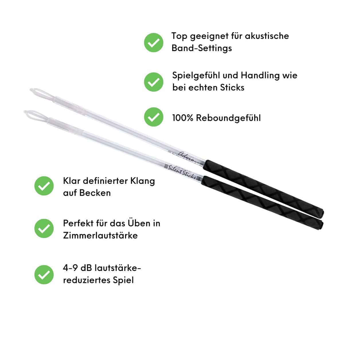 Silent Sticks & Beaters de Adoro están diseñados para tocar en vivo en primer lugar, para actuaciones íntimas en salas de estar y para sesiones de grabación. ¿Funcionan las baquetas en platillos y cualquier tipo de tambor? Sí, y Silent Sticks logran un excelente sonido muy similar al de las baquetas regulares. Los batidores también son ideales para tocar en un cajón. ¿Cuánto más silenciosos son que las baquetas y batidores normales? Son aproximadamente 4-9 dB más silenciosos, gracias no solo al peso ligero de su eje de policarbonato, sino también a las puntas reflexivas Dual-Twist, que absorben la mayor parte del impacto, se flexionan y, a diferencia de varillas y soluciones similares, dan a la baqueta su rebote, solo mucho más silencioso. ¿Qué durabilidad tienen en comparación con las baquetas de madera normales? En comparación con las baquetas de madera liviana, Silent Sticks duran aproximadamente dos a tres veces más y especialmente mucho más que las varillas de madera. ¿Pueden ser mejores que un protector de batería de Plexiglás? De hecho, Silent Sticks reducen el ruido de la batería sin afectar masivamente su sonido. ¿En qué se diferencian los Batidores Silenciosos de otros macillos de bajo ruido? Nuestros macillos tienen una almohadilla adicional delgada y otra gruesa, que no solo sirve para amortiguar, sino que reduce la fricción en la cabeza, los batidores convencionales suelen dañar fácilmente las cabezas de tela. Por eso nuestras almohadillas tienen un recubrimiento de teflón para minimizar la fricción.