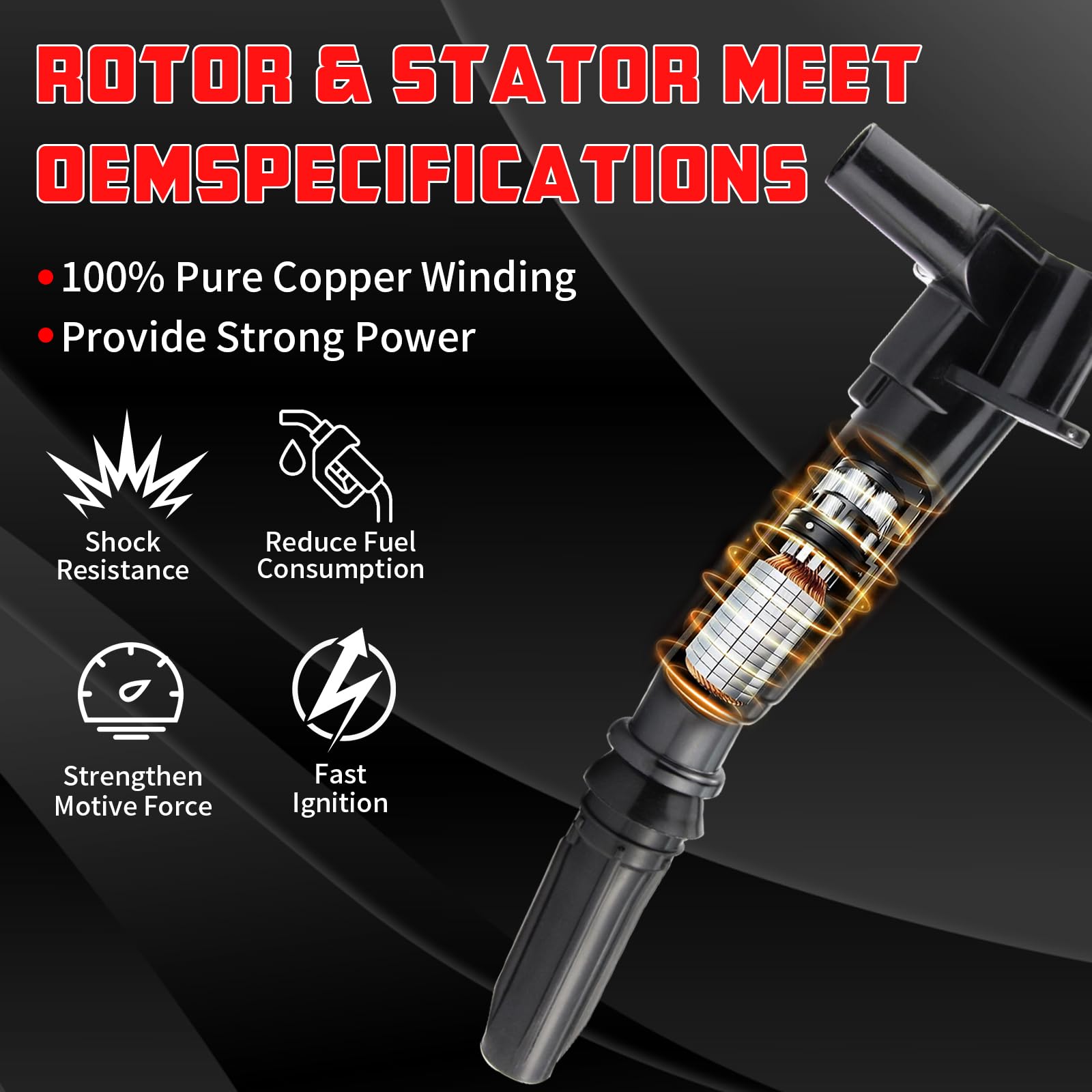 4. Alta Calidad: Las Bobinas de Encendido KELHILNII están hechas de materiales de primera calidad, resorte de acero inoxidable con supresor de ruido de ferrita interna que evita la interferencia de radiofrecuencia, el conector de bobina termoplástico avanzado asegura una conexión adecuada y resiste las fracturas causadas por el calor y el ciclismo térmico, para transferir mejor el alto voltaje creado por la bujía del motor.
