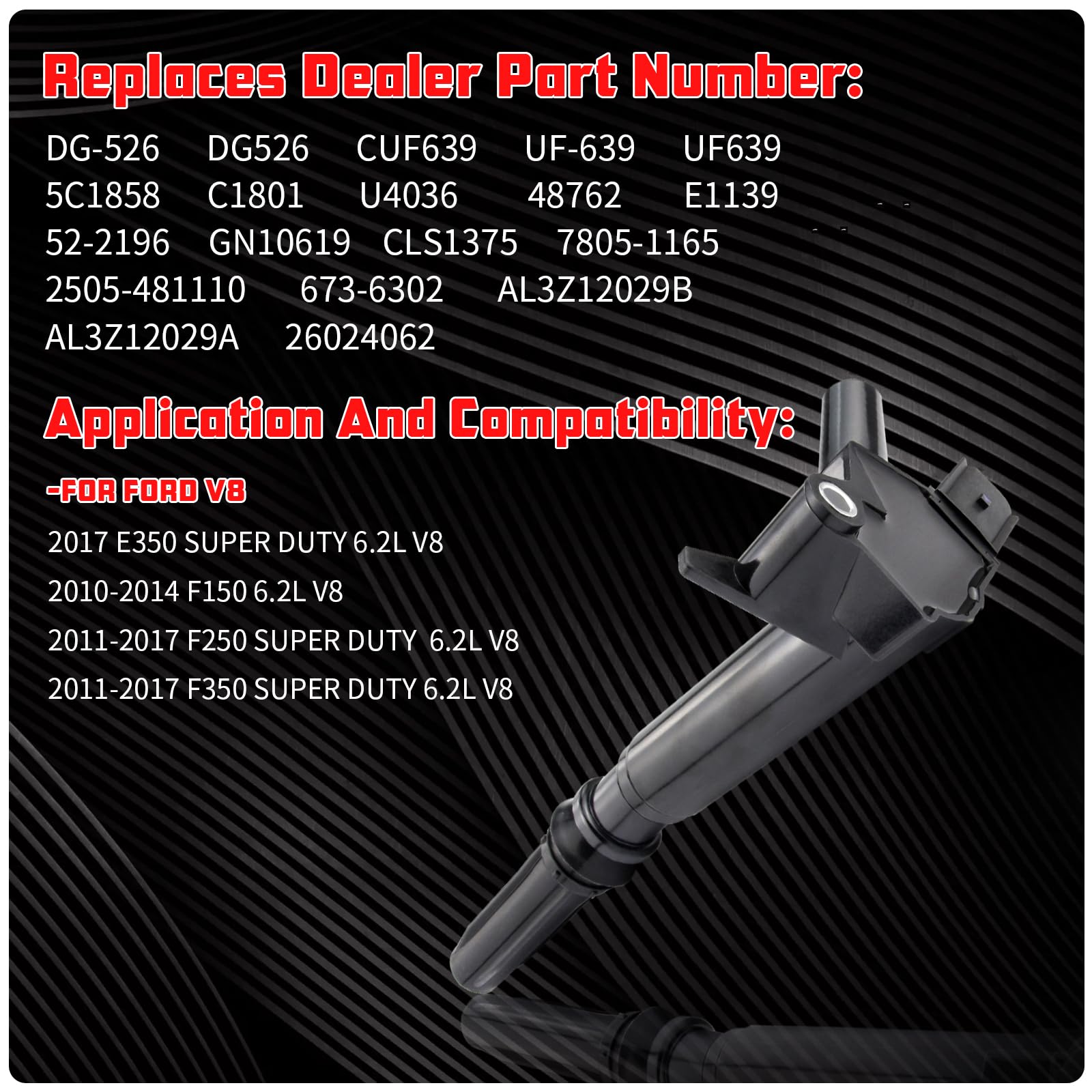 1. Bobina de encendidoVehículos Compatibles con Ford: Para Ford 2017 E-350 Super Duty, Para Ford 2010-2014 F-150, Para Ford 2011-2017 F-250 Super Duty, Para Ford 2011-2014 F-350, Para Ford 2011-2017 F-350 Super Duty, Para Ford 2011-2014 Lobo.