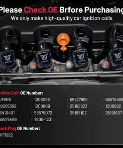 1. Información básica: La bobina de encendido UF669 y la bujía XP3922 son compatibles con Buick Encore 2013-2019, Chevy Cruze 2011-2015, Cruze Limited 2016, Sonic 2012-2019, Trax 2015-2019, Volt 2011. Por favor, verifique la información detallada de compatibilidad en las imágenes o en la página de detalles. La verificación OE es necesaria antes de comprar.