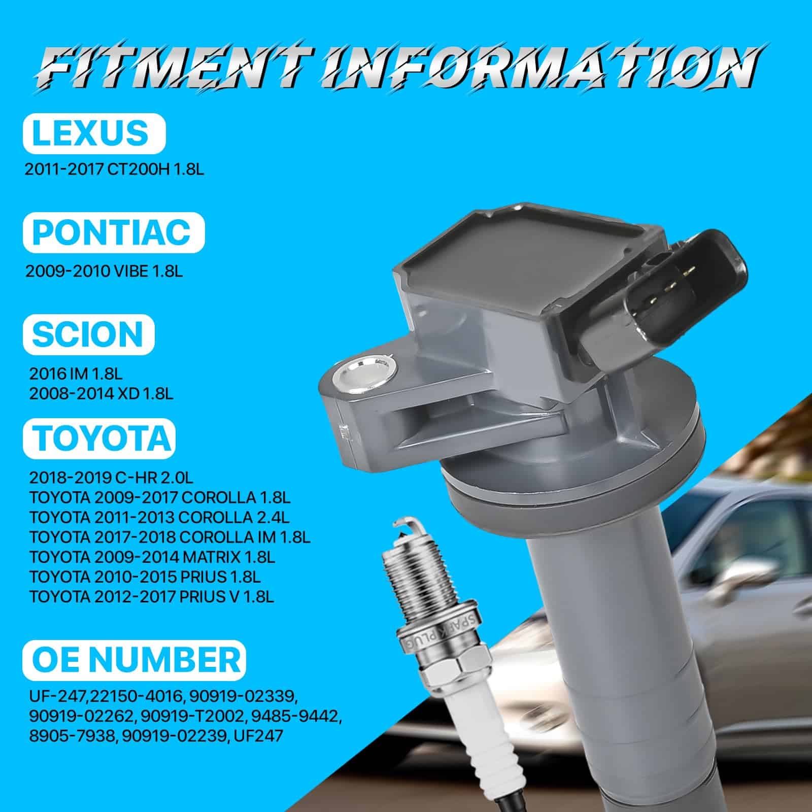 Compatible con Chevrolet: 1999-2002 Prizm 1.8L, Compatible con Pontiac: 2003-2008 Vibe 1.8L, Compatible con Toyota: 2000-2005 Celica 1.8L, 2000-2008 Corolla 1.8L, 2003-2008 Matrix 1.8L, 2000-2005 MR2 Spyder 1.8L. Números de parte de repuesto: 9008019015, 9008019019, 9091902262, 90919T2002, 94859441, 94859442, UF-247, UF247, 6731300, GN10314, C551, 9212013, 5C1074, 48998, 1788302, 358000421.