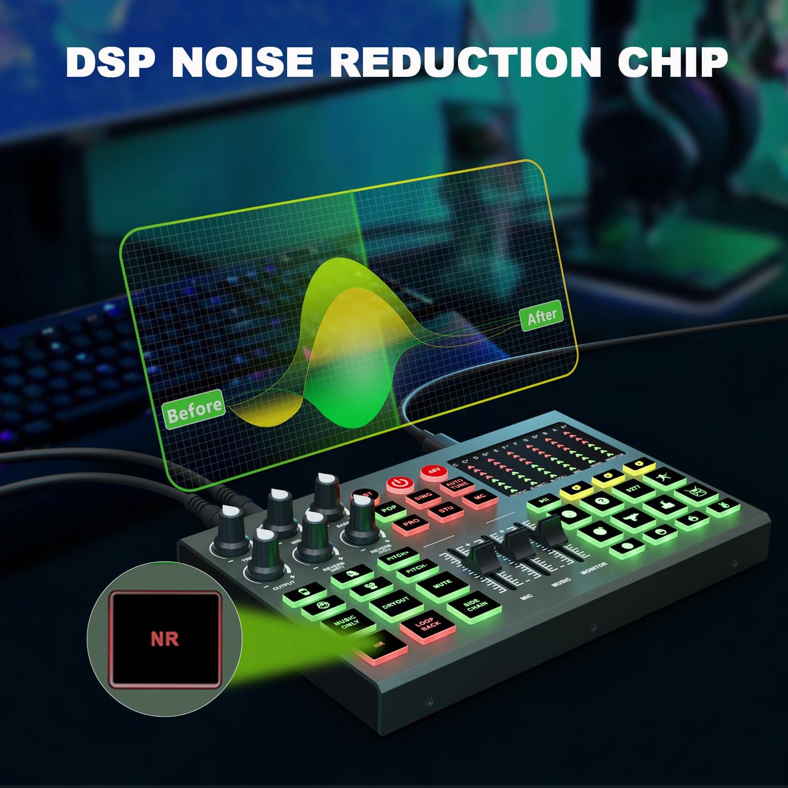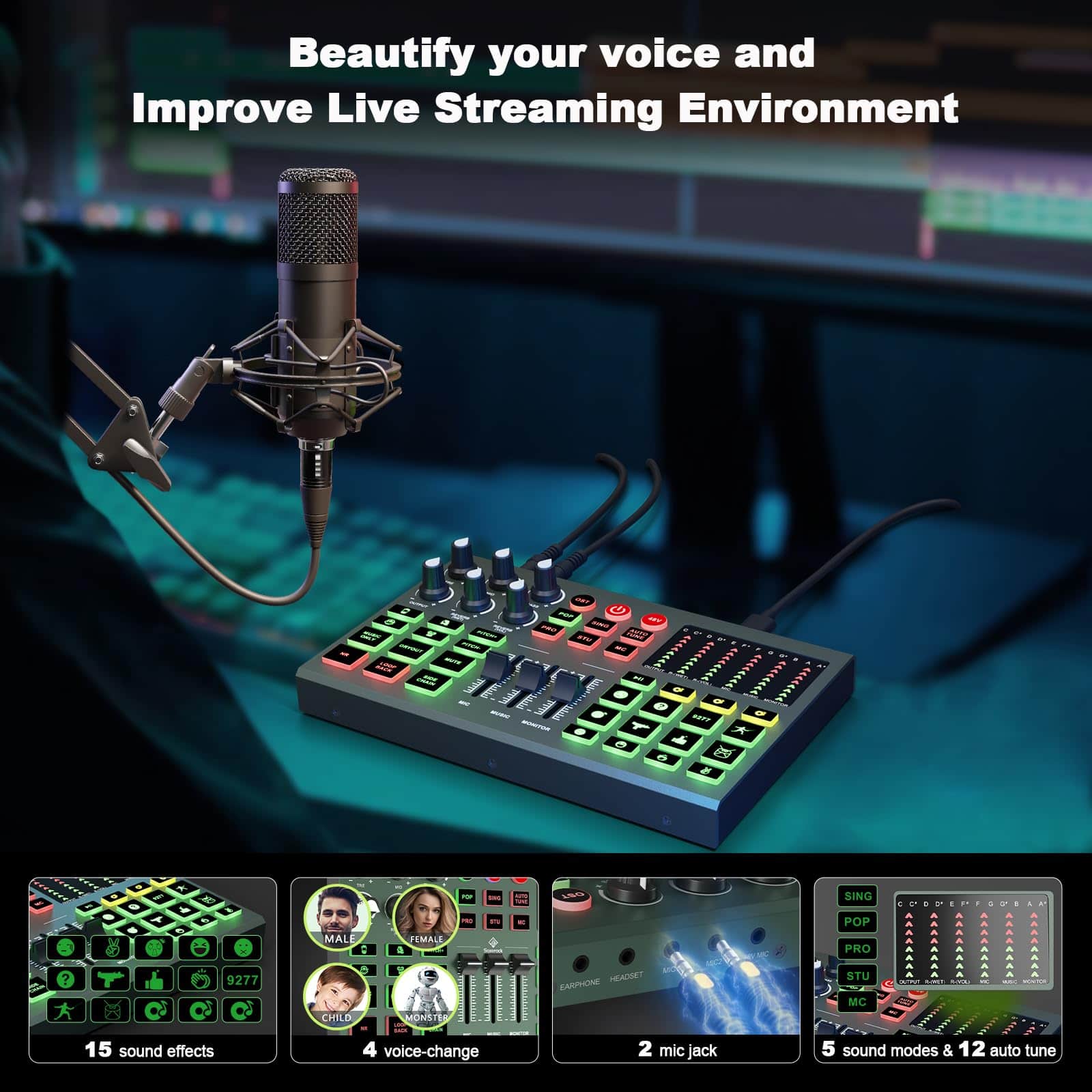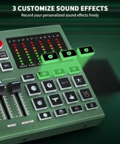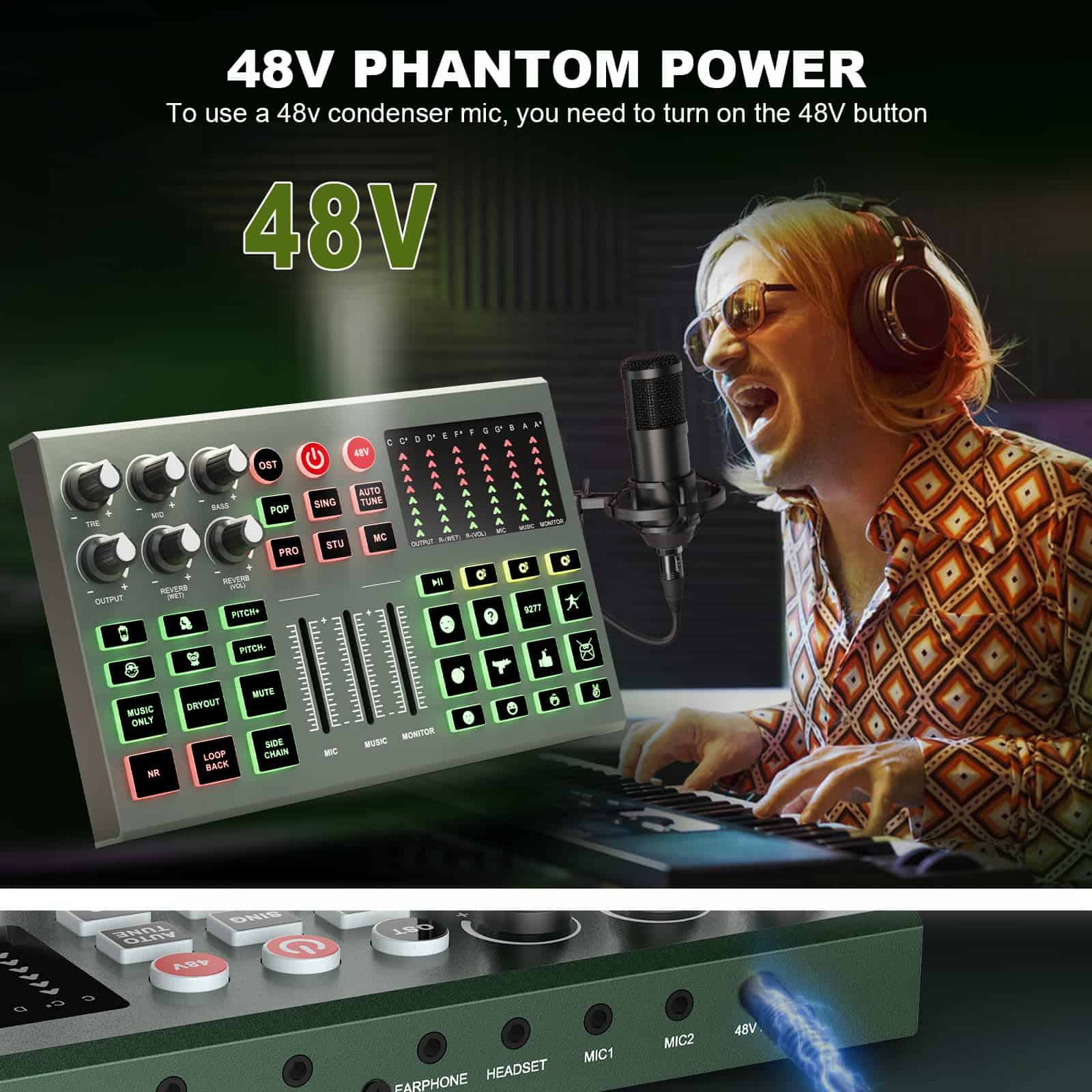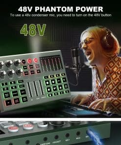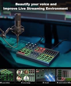 1. Nacido para transmisiones en vivo: Esta mezcladora de audio admite 3 personas para transmitir simultáneamente. Destacados de este set, puedes cambiar tu voz a masculina, femenina, infantil, monstruosa. Con 3 entradas de micrófono, soporta alimentación phantom de 48v. Produce 12 efectos de sonido, 6 modos de sonido, 12 auto ajustes de tono, 15 características básicas: reducción de ruido, mute, loop back, side chain.