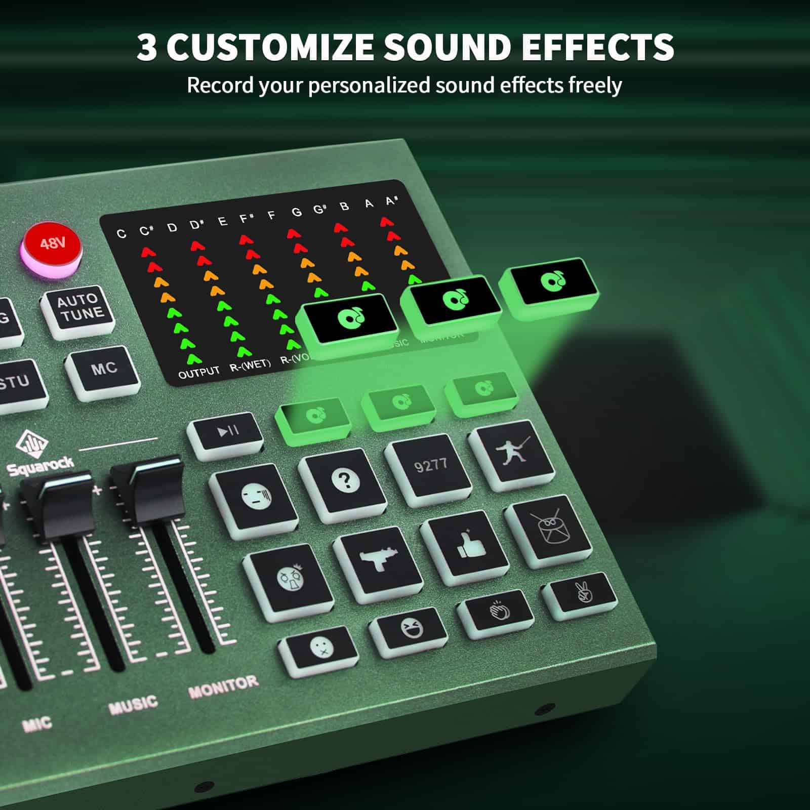 3. 3 Efectos de sonido personalizables: Este paquete de equipos de podcast incluye 3 botones de efectos personalizables, cada uno puede durar 12 segundos, puedes grabar tu propia voz libremente mientras grabas música a través de PC, smartphone o dispositivos BT.