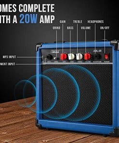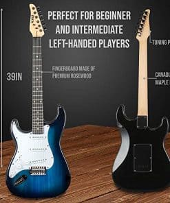 Todo lo que necesitas para empezar a tocar: el kit incluye todo lo que necesitas para empezar a tocar Guitarra eléctrica de tamaño completo de 39″ para zurdos Amplificador de 20W Afinador digital de pinza 6 cuerdas 2 púas Barra de trémolo Correa para el hombro Estuche de transporte Amplificador de 20W: el amplificador de 20W es perfecto para el guitarrista principiante. Completo con jack para auriculares y overdrive, obtendrás un gran sonido de alta calidad. Afinador digital de pinza: tocar afinado es esencial para cualquier guitarrista. El afinador digital incluido asegura que tu guitarra esté perfectamente afinada cada vez que te sientes a tocar. Instrucciones fáciles de seguir harán que afinar sea muy sencillo.