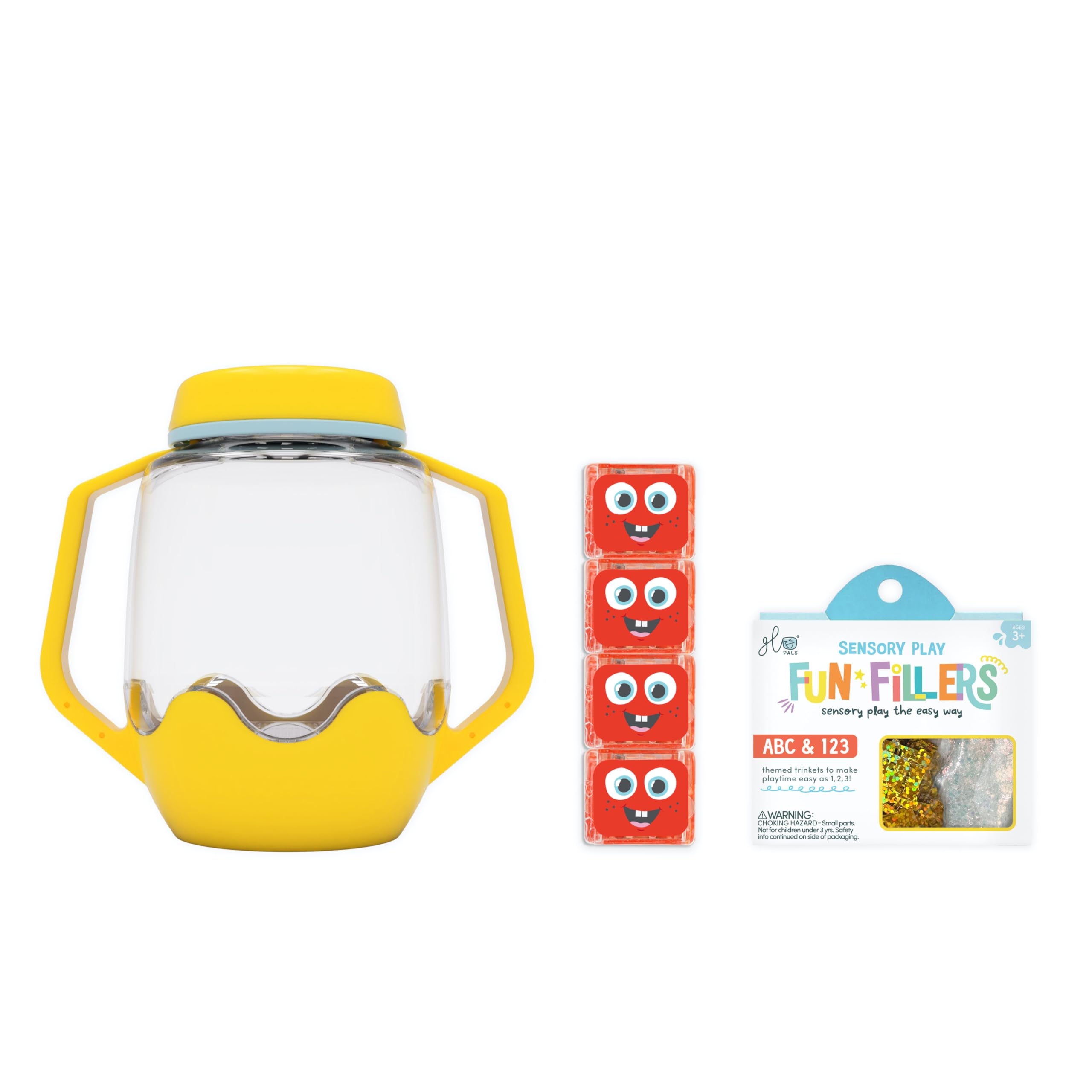 Perfecto para juego sensorial en movimiento! Los paquetes de juego sensorial Glo Pals incluyen todo lo que necesitas para crear una experiencia sensorial fascinante y tranquila para los niños. El paquete de juego sensorial Fácil como ABC incluye un tarro de juego sensorial amarillo con luz, un paquete de rellenos divertidos ABC y 123, y un paquete de 4 Cubos de Luz Roja Sammy de Glo Pals.