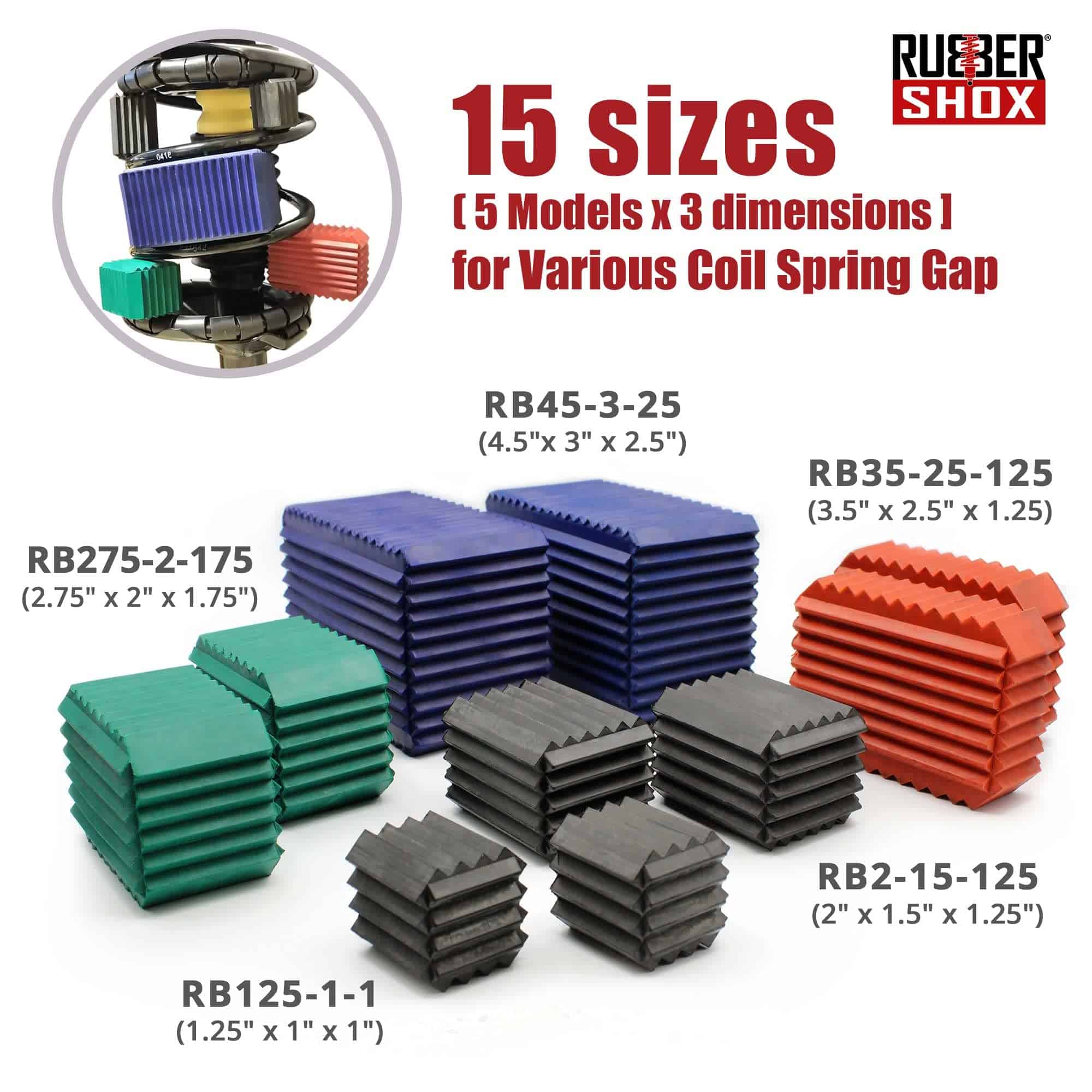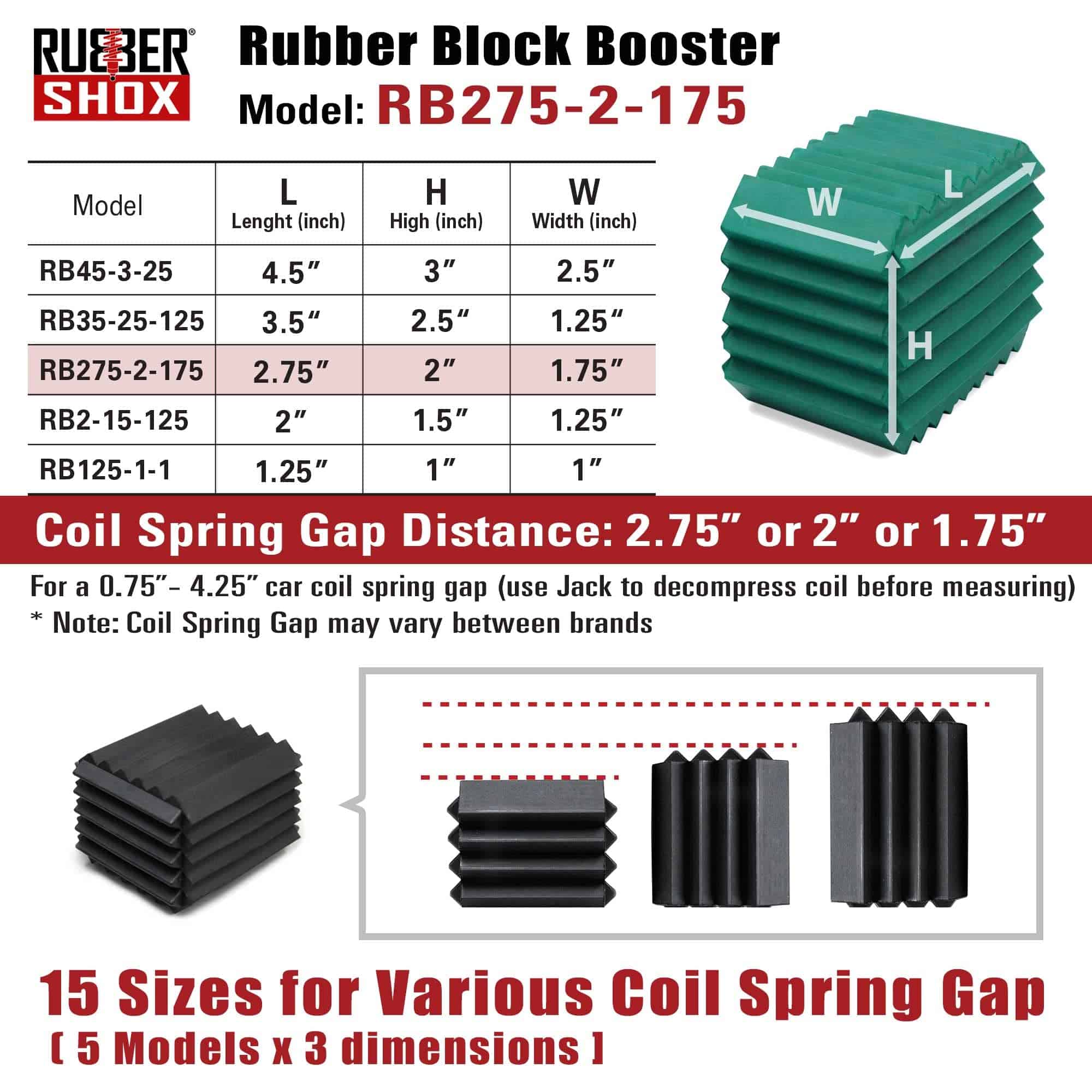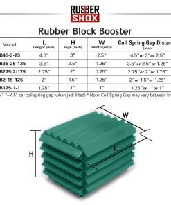1. Dimensiones del producto: Por favor, consulte la tabla de tallas en la sección de Fotos y el Manual de Usuario en la sección de Especificaciones Técnicas; Por favor, permita el espacio del resorte de bobina del automóvil (cuando está levantado). Nota: la brecha del resorte puede variar entre marcas. 2. Material de calidad: Los refuerzos de resorte de bobina de la marca RubberShox son de caucho natural; Especialmente formulado para altos niveles de compresión y resistencia a la tracción para aplicaciones comerciales. Mientras que los amortiguadores redondos rodean los resortes de bobina, los refuerzos de RubberShox proporcionan soporte adicional desde dentro de los espaciadores de bobina mismos. 3. Serie de refuerzos de bloque de goma de amplio rango (2 piezas por paquete – Varias opciones de tamaño disponibles): Ofrecido en 5 tamaños diferentes; Para una brecha de 1 4.5 de resorte de bobina del automóvil (cuando está levantado). Nota: la brecha del resorte puede variar entre los fabricantes de automóviles. 4. Material multifuncional: Caucho natural certificado Shore A 65 para alta compresión y resistencia a la tracción. Son ideales para climas fríos de invierno y condiciones de carretera difíciles. Resisten la abrasión, no se agrietan y prolongan la longevidad de la suspensión del vehículo. 5. Estabilidad mejorada: Previene el hundimiento del resorte con soporte adicional desde dentro de los resortes de bobina. Esto amplifica la absorción mientras mitiga el impacto de las condiciones de la carretera.