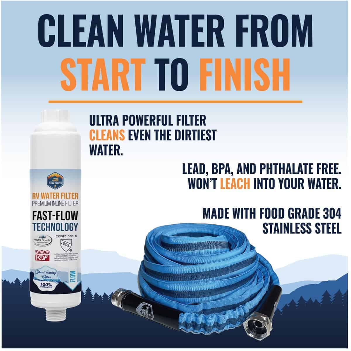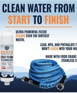 ¡Transforma tus aventuras en RV con el Paquete de Manguera de Agua Potable y Filtro Clean Camper! Este paquete exclusivo combina una manguera de agua potable de acero inoxidable suave, flexible y con accesorios de acero inoxidable de 35 pies, diseñada para ser libre de dobleces y ligera, con nuestro filtro de agua premium para una pureza del agua sin igual. Disfruta de agua fresca, segura y deliciosa directamente del grifo de tu RV, con cada componente certificado como libre de BPA y plomo para darte tranquilidad.
