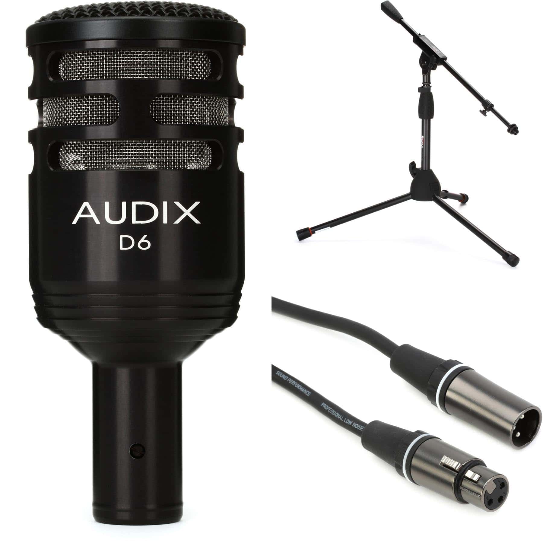 Paquete de micrófono que incluye el potente Micrófono Audix D6 diseñado específicamente para capturar el sonido del bombo con claridad y precisión. El micrófono D6 tiene un patrón polar cardioide que minimiza el ruido de fondo no deseado y se adapta perfectamente a las necesidades de captación de sonido de baterías y amplificadores de baja frecuencia.